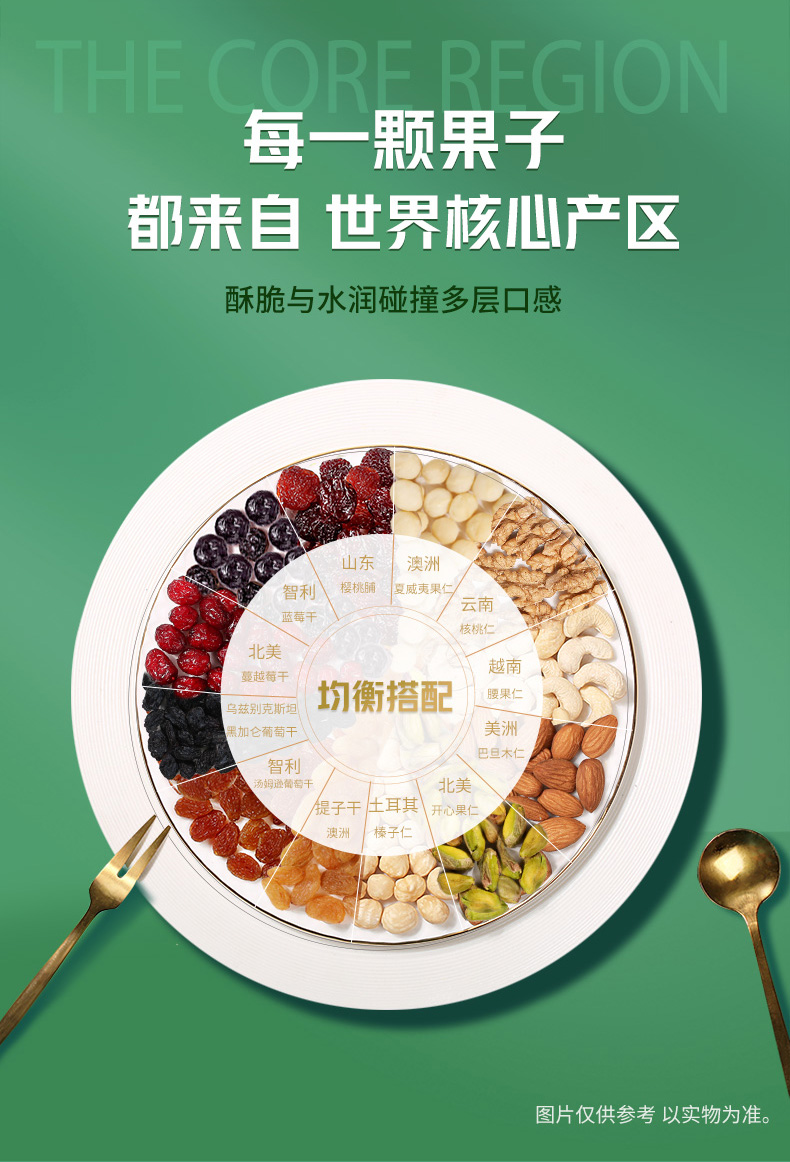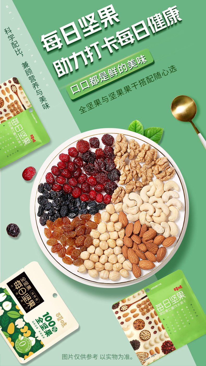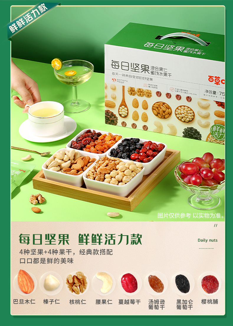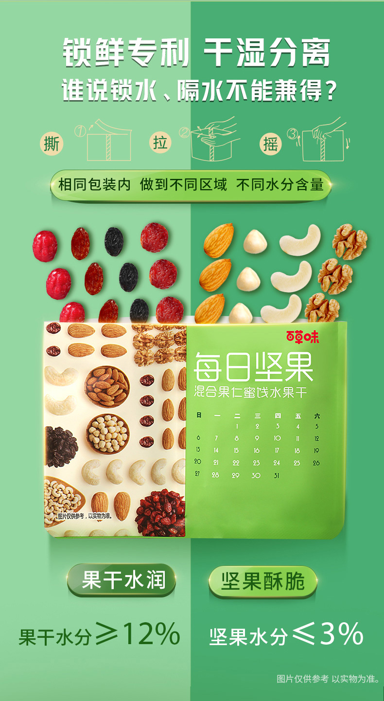 专利分区锁鲜,坚果水分<4%、果干水分14-20%,坚果酥脆。果干鲜嫩,口感更佳是名副其实的高端款。规格:25g*30袋 礼盒装,自用送人都适合。