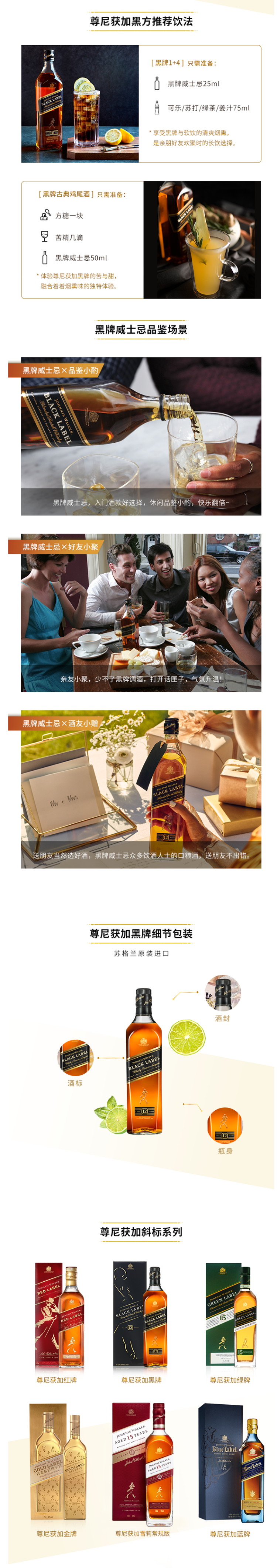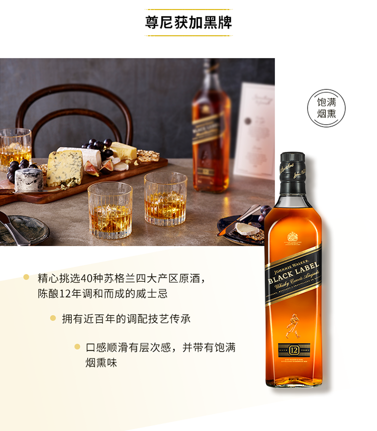 黑牌是尊尼获加最负盛名的一款,也是性价比最高的一款威士忌,12年以上的橡木桶陈酿,经由百年配方调配。