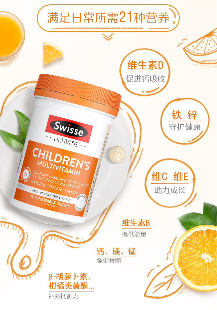 Swisse是澳大利亚著名的保健品品牌,荣获多种大奖,品质可靠,这款儿童复合维生素,是专为儿童研制的配方,富含21中营养,每日一片随餐服用补充日常所需,规格:120片/瓶