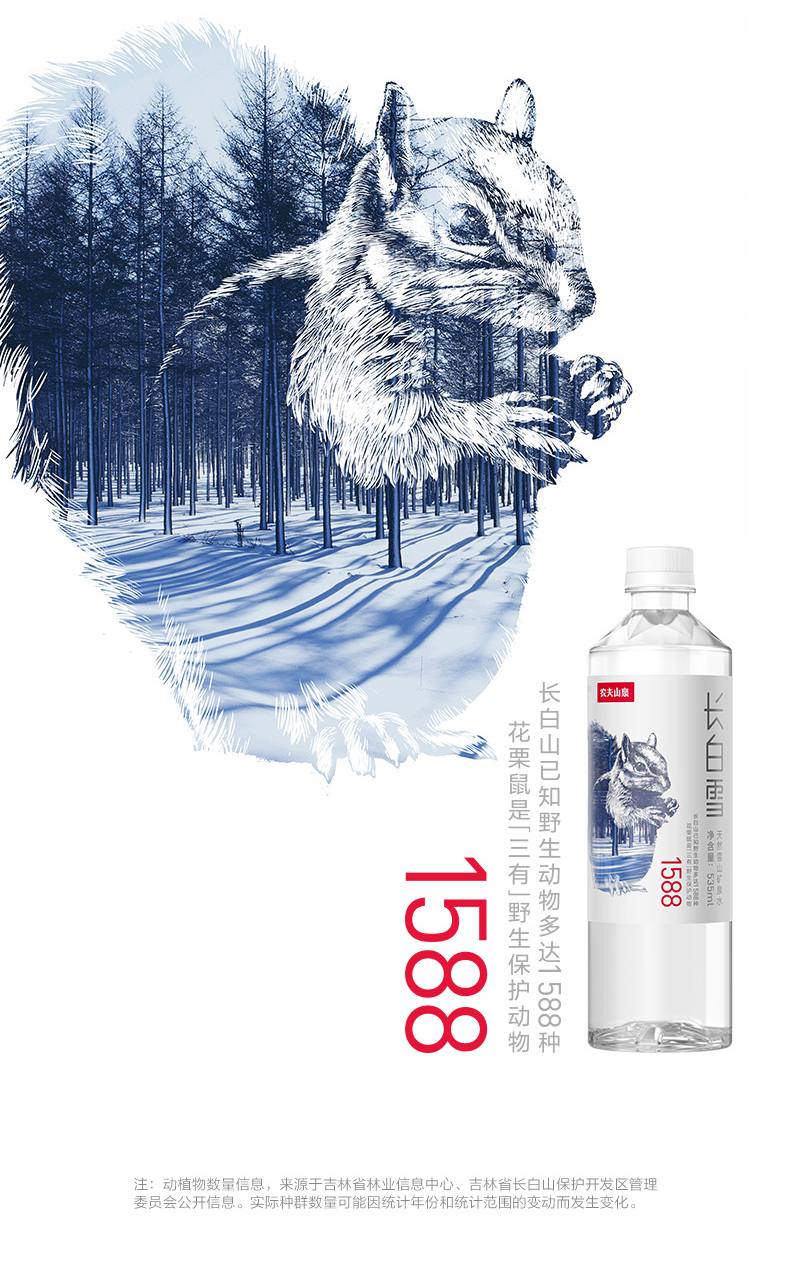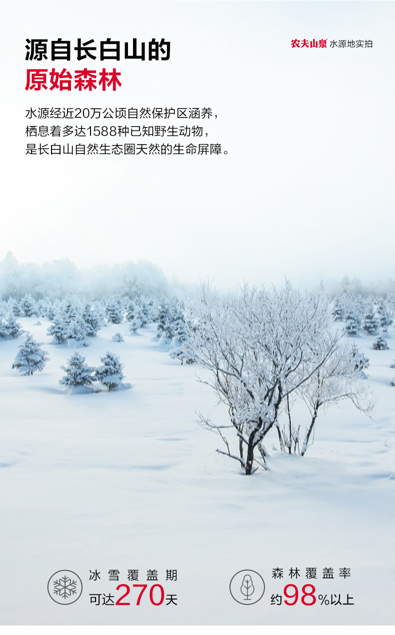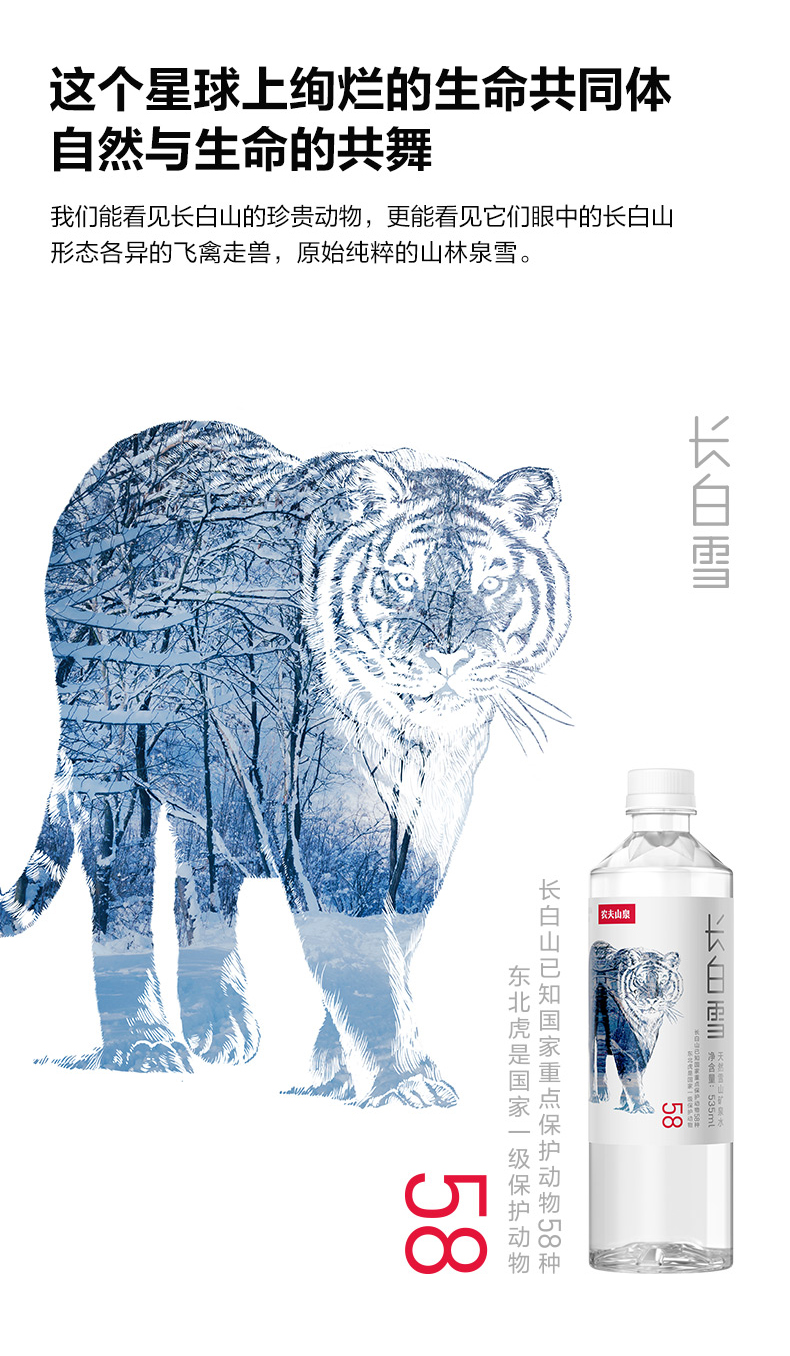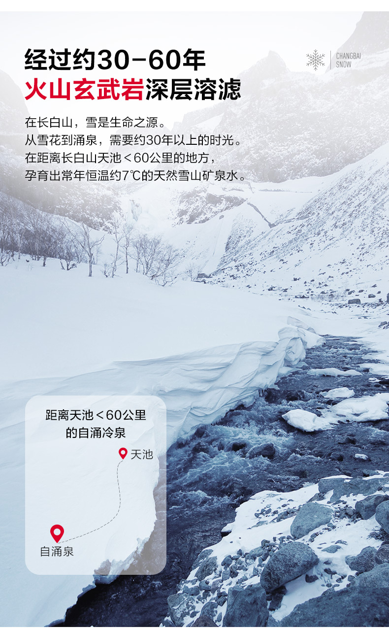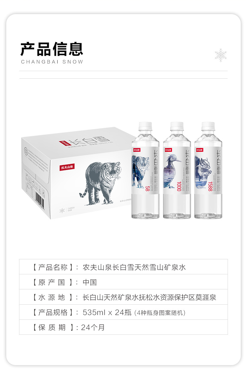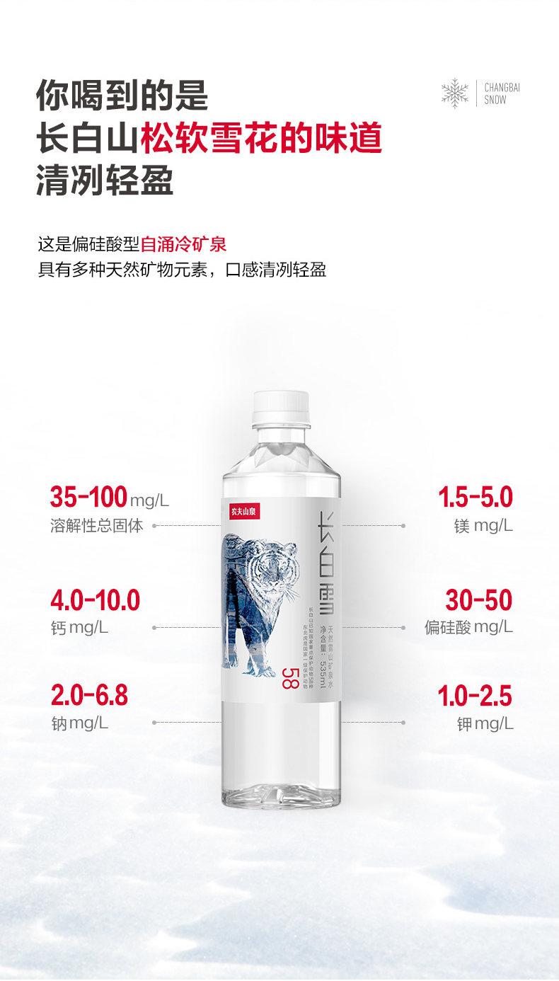 农夫山泉出品的高端矿泉水,水源来自长白山原始森林的天然雪山矿泉水,经过30-60年的深层溶滤、天然净化,孕育出常年恒温7℃的天然雪山矿泉水,富含钙、镁、钠等多种矿物质,还富含偏硅酸,瓶子的设计和质感都非常高端。