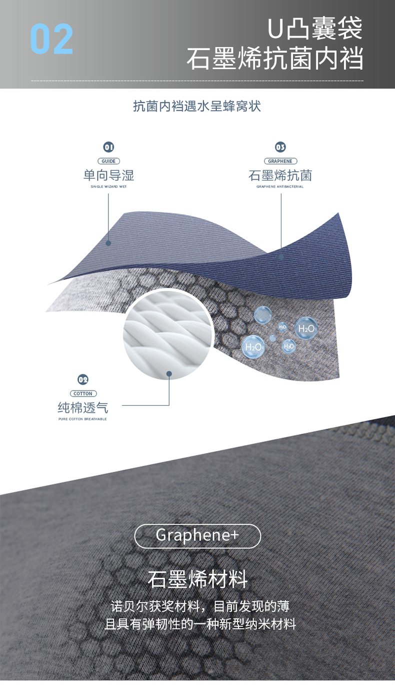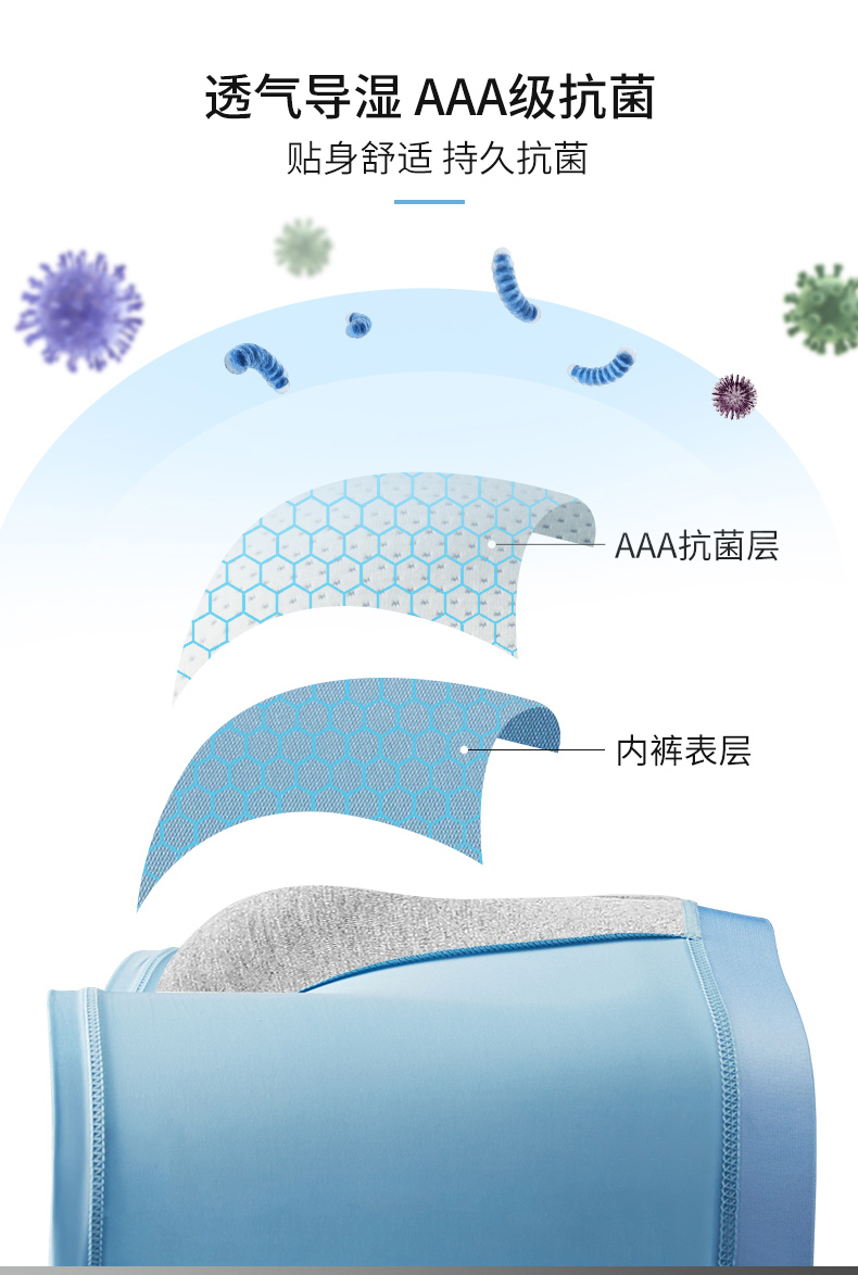 AAA级石墨烯抗菌内档,由再生纤维素纤维93%、聚酯纤维2%、氨纶5%多种材料混纺,面料轻柔透气,排汗速干。内衬网孔设计,进一步增加了透气性,体感更舒适。
