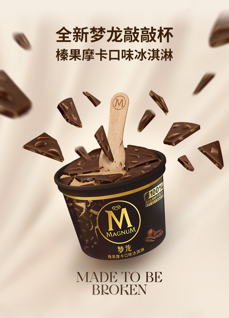 这款是梦龙去年的新品,使用100%比利时原装进口巧克力,外层为进口巧克力,内里搭配海盐焦糖流心酱和经典香草冰淇淋,搭配着醇厚的巧克力片坚果碎,捏后敲开顶盖食用,吃起来也很有乐趣,甜食爱好者必备。