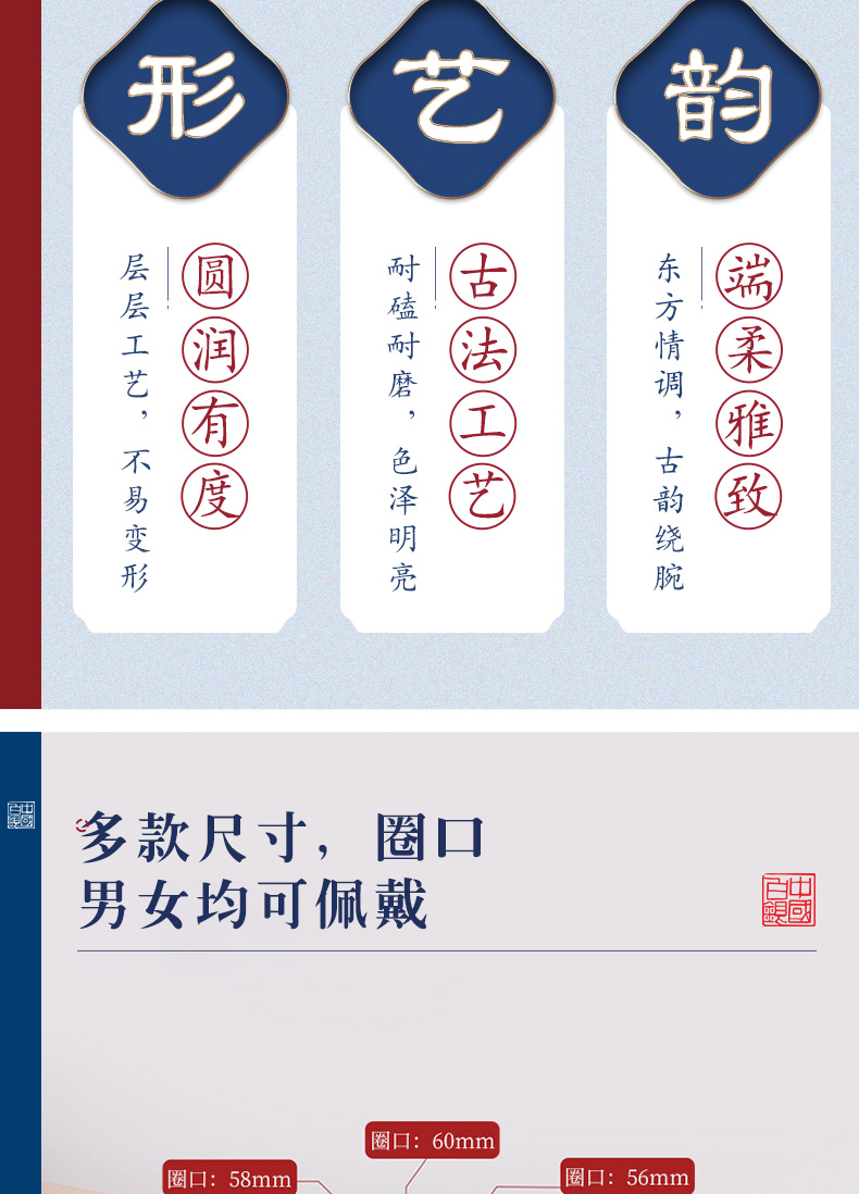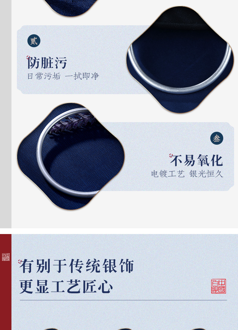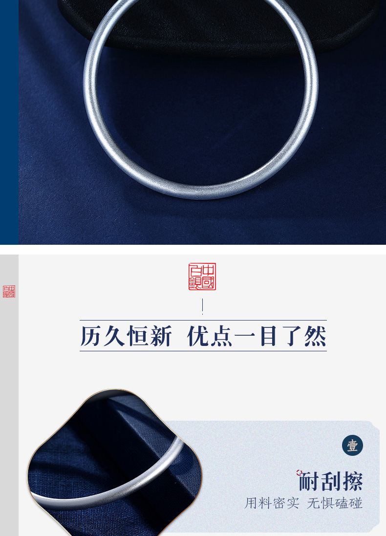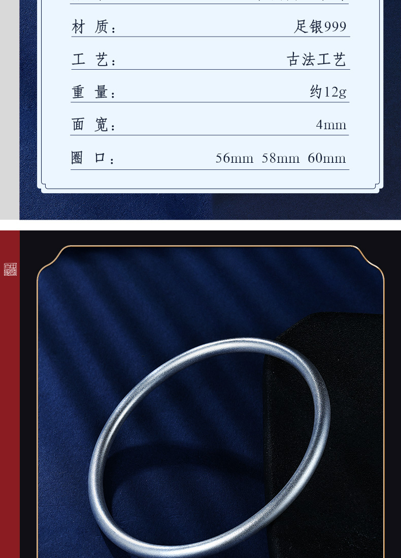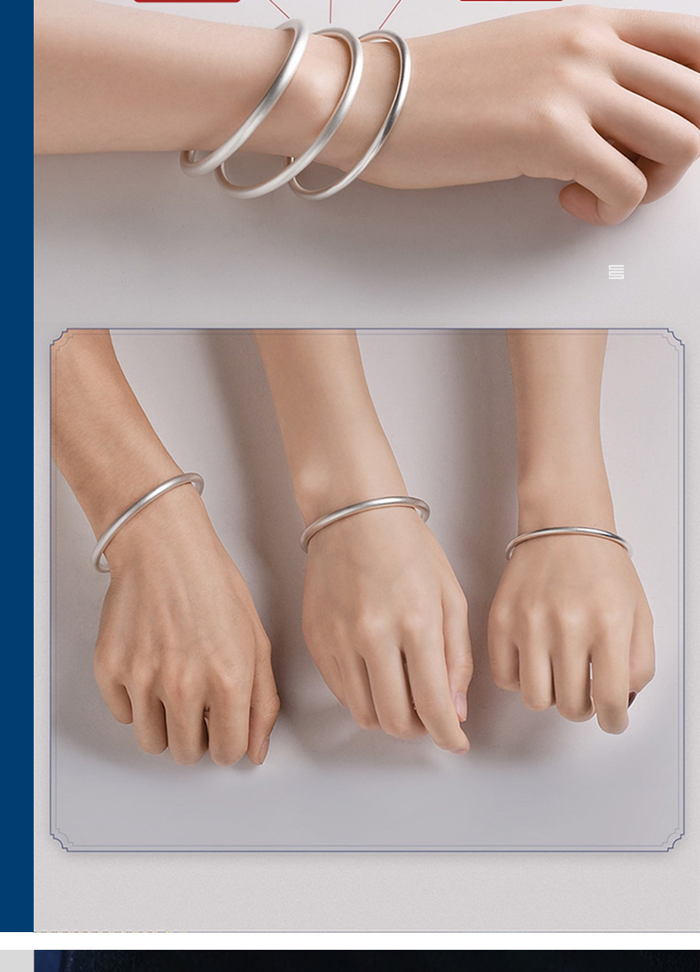 中国白银集团有限公司 女士999千足银磨砂手镯不加以浓墨重彩,越繁杂而回归的自然美,别有韵味。采用中国古法银手工技艺,将古法技艺与传统文化相交融。千年古法手工银器,传承中华经典匠心精神。诠释优雅、质朴且精巧的银饰东方美学、成就质感美物,赋传统文化之魂。