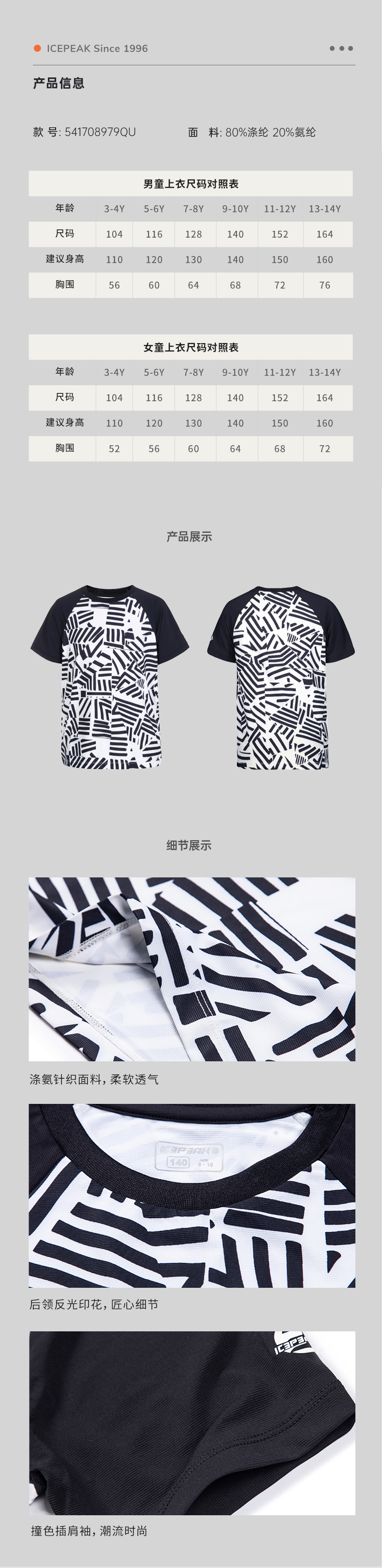 这款艾斯匹克icepeak儿童印花T恤,使用80%聚酯纤维+20%弹力氨纶混纺而成,比纯棉更吸湿透气、干爽不贴肤,吸湿排汗效果明显,上身透气凉爽,非常适合夏季穿。
