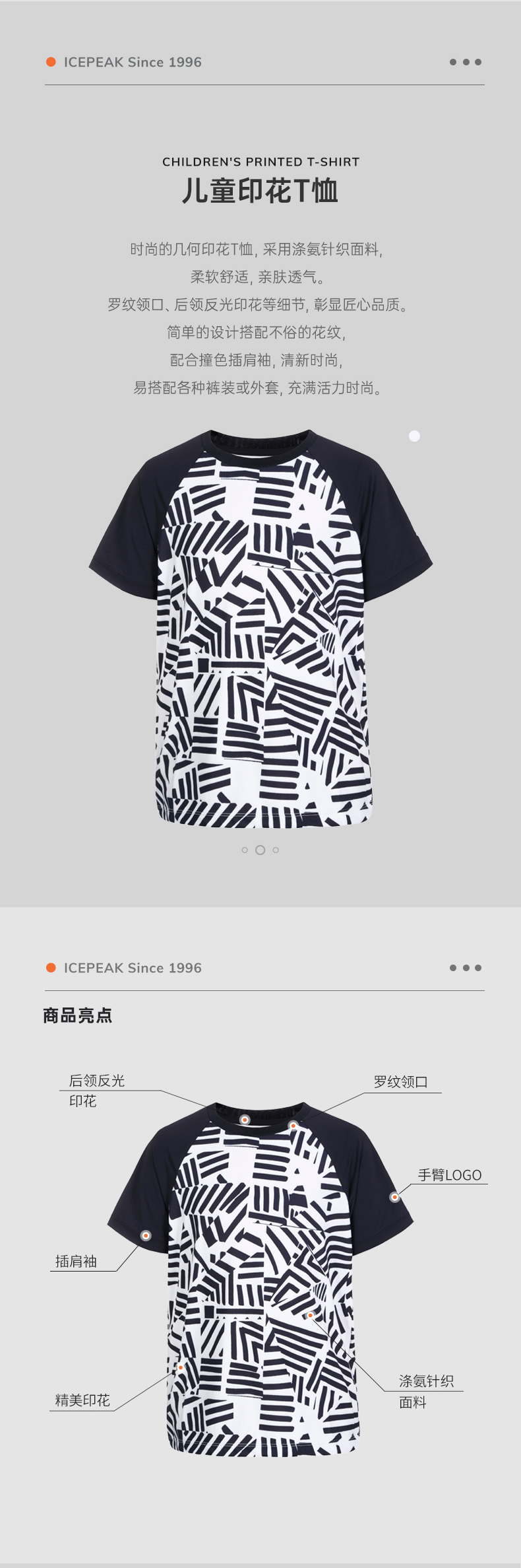 在款式上,合身版型,胸前是时尚几何印花,搭配撞色插肩袖,清新时尚,工艺上走线整齐无线头,后领拥有反光印花。