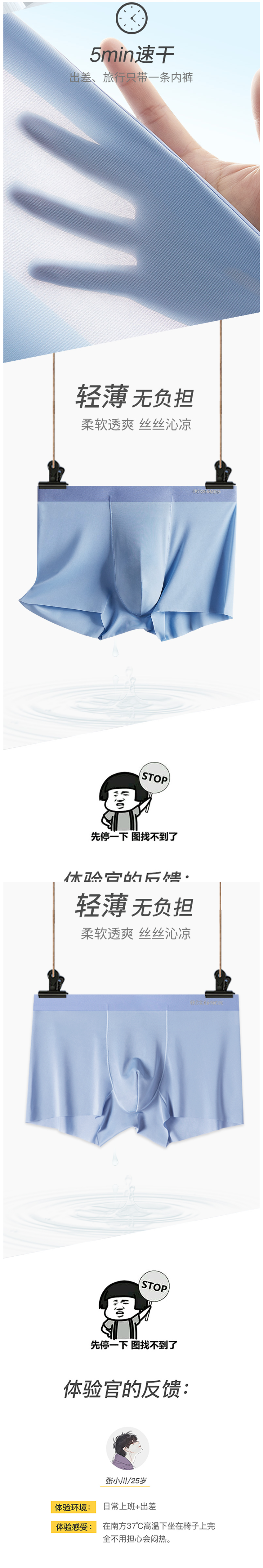 这款恒源祥男冰丝弹力薄平角无痕内裤,是2021年的新款,大身使用92%聚酯纤维/冰丝+8%氨纶弹混纺而成,摸着柔软舒适,上身吸湿速干透气有凉感,弹力也好,上身不紧绷。
