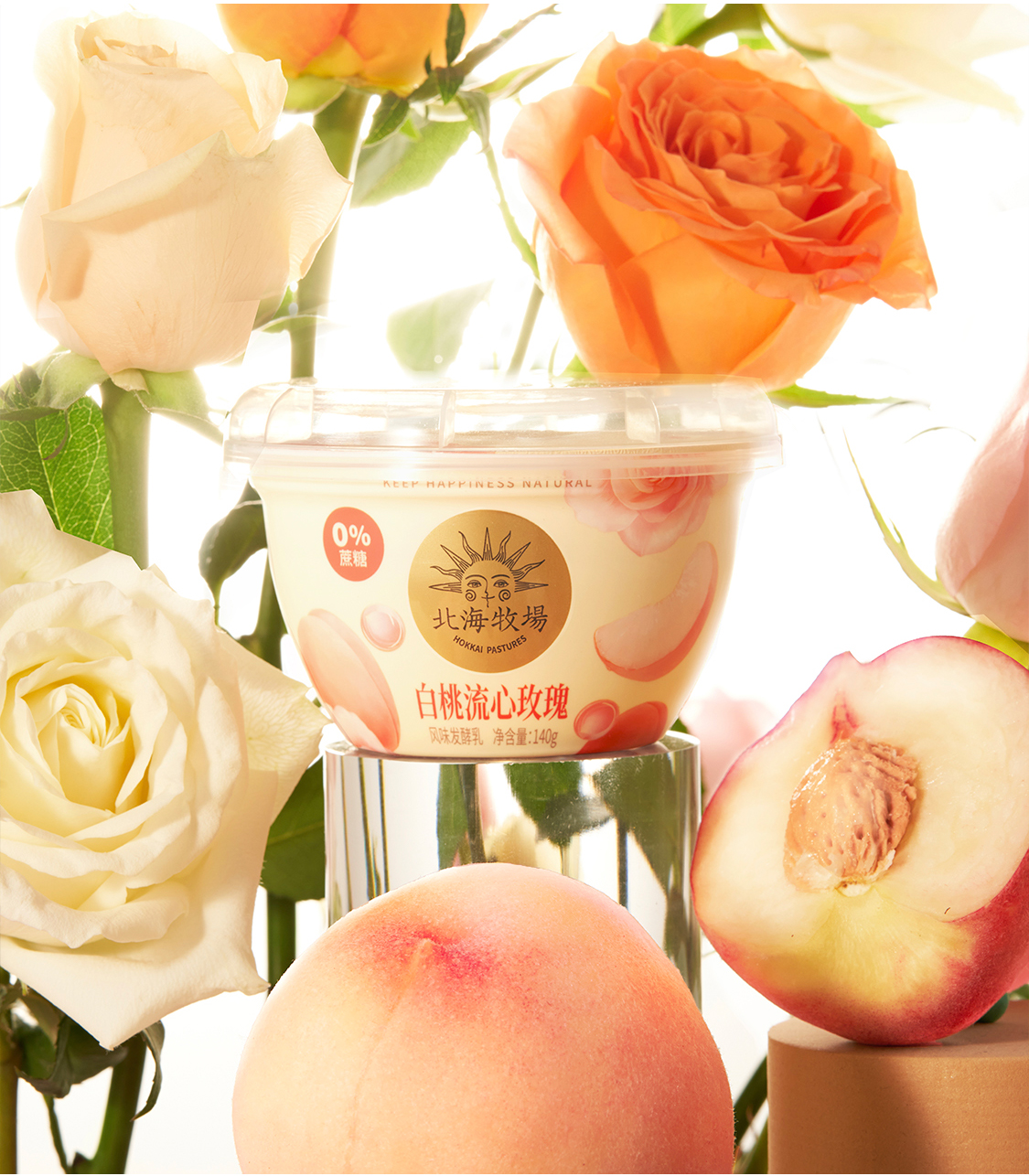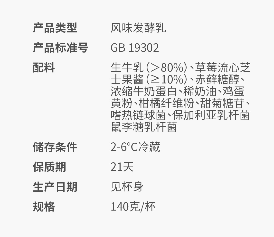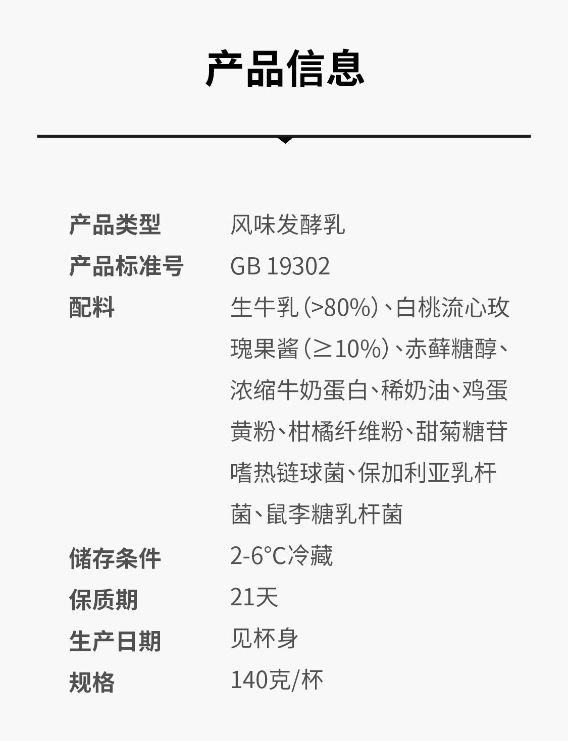使用纯生牛乳(鲜奶)发酵,添加芝士流心珠和大颗粒草莓、桃子果肉、重瓣玫瑰花,拥有7.7g高蛋白含量和182mg/杯高钙,蛋白质含量是国家标准的2.3倍,不添加稳定剂、增稠剂,口感香醇浓厚,非常健康,一杯热量和三分之二苹果相当。