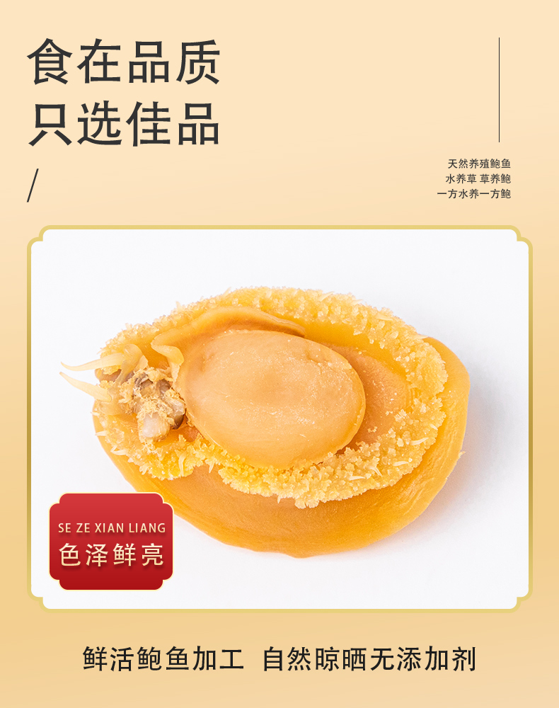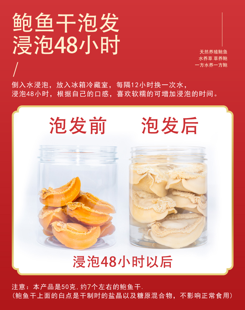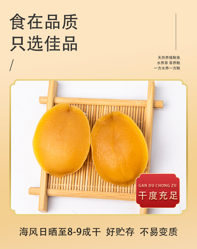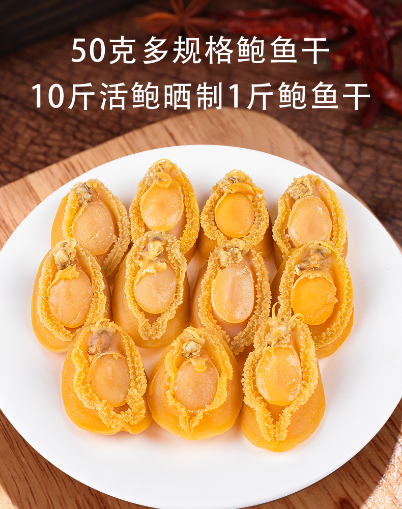 这款鲜伴淡晒特级大鲍鱼干,产自自福建东南部兴化湾的南日岛,在纯净海域自然生长,人工捕捞,经过自然晒干而成,不是缺氧鲍,干度是8~9成,收到后需要泡发。