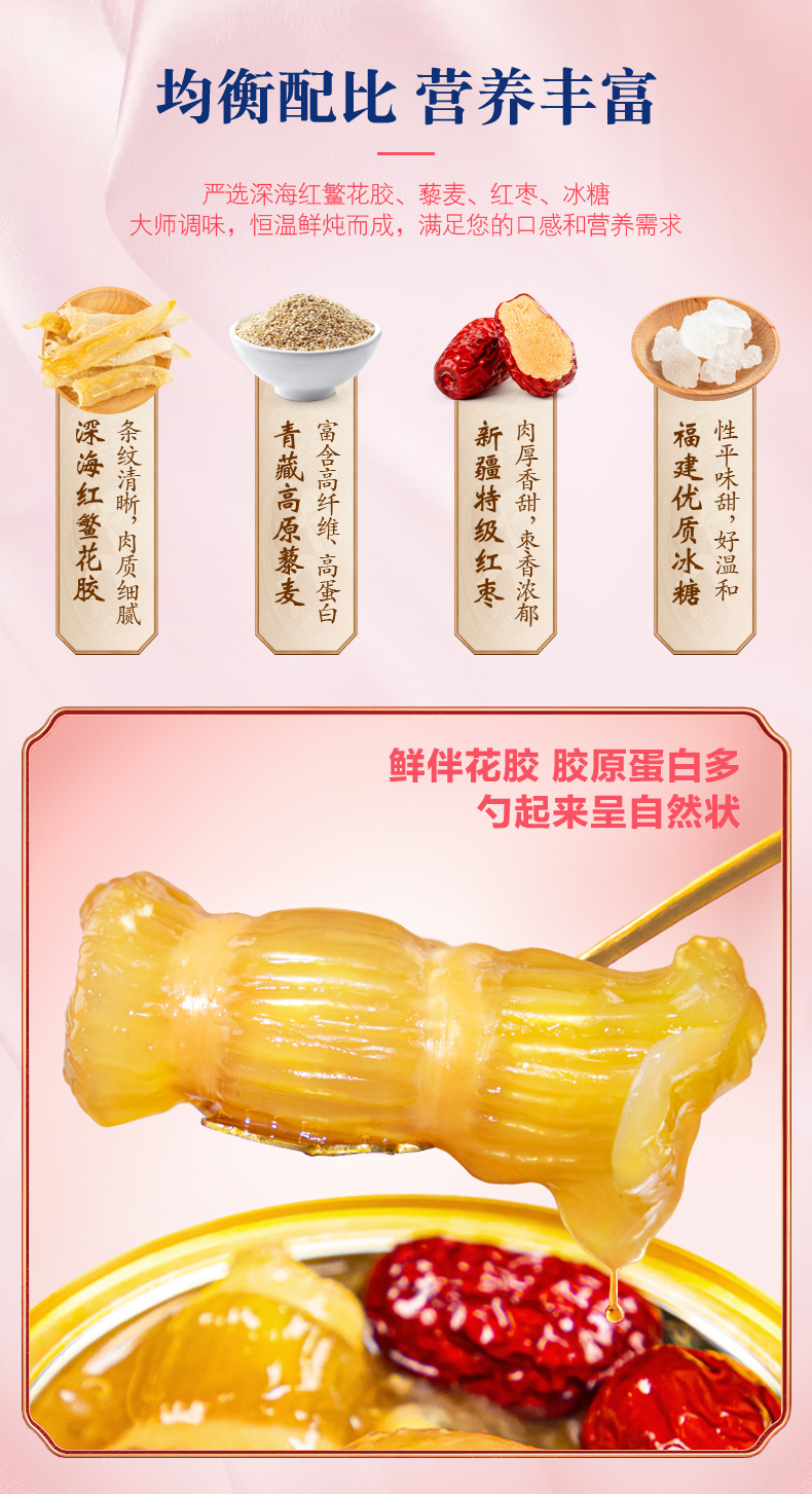 这款鱼胶干货,精选大块深海红鳘鱼胶,搭配青藏高原藜麦、新疆特级红枣、福建优质冰糖经过恒温多阶段鲜炖,胶原蛋白小分子更易析出,更易于皮肤吸收。