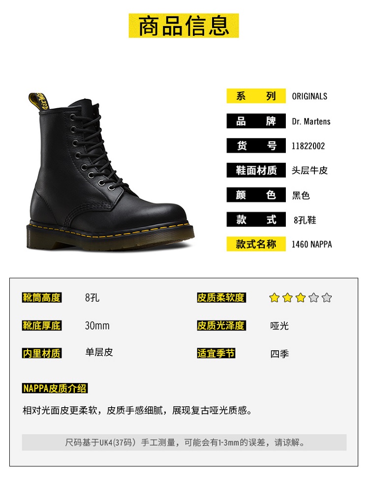这款女马丁靴,是其招牌款1460「官网地址」,是马丁最出名的鞋款。型号1460倒过来就是鞋子的诞生时间,代表了这款鞋的是1960年4月1日发布的,已经火了半个世纪。