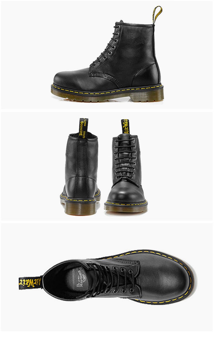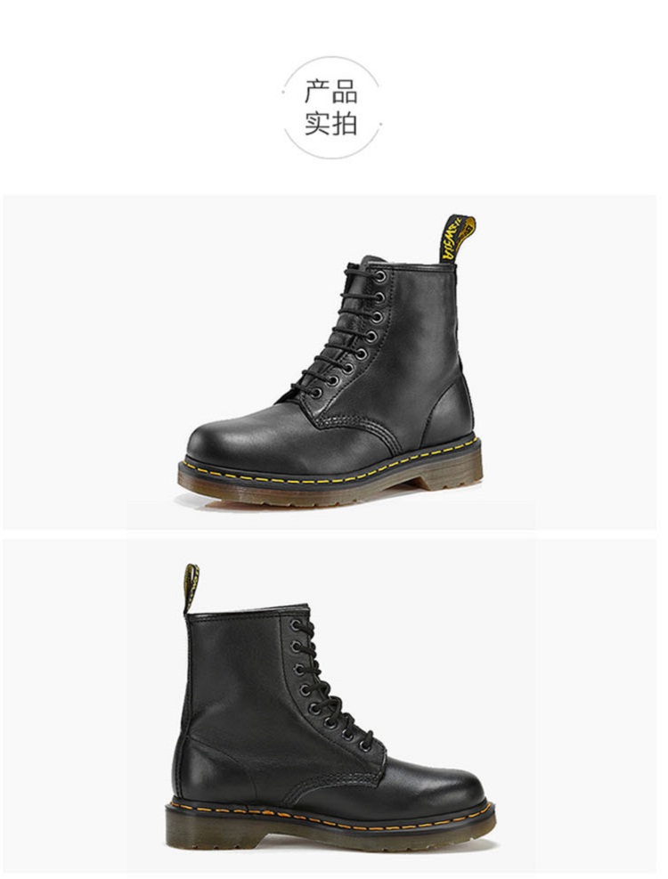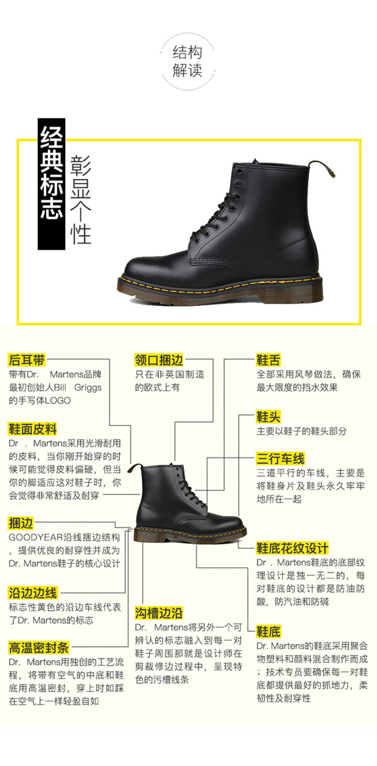 英伦风,八孔系带,软皮鞋面(头层牛皮),光亮帅气,上脚好看有档次;软垫风琴鞋舌,真皮衬里,上脚舒适;鞋面和鞋底以Goodyear坚固式缝合制法缝合,而非胶粘,所以非常牢固,即使穿着多年也不会担心开胶,马丁靴标志性的Air Wair鞋底自然也必不可少,由蜂窝式的空间和拇指头位置的软垫组合而成,舒适缓震,不易疲劳。
