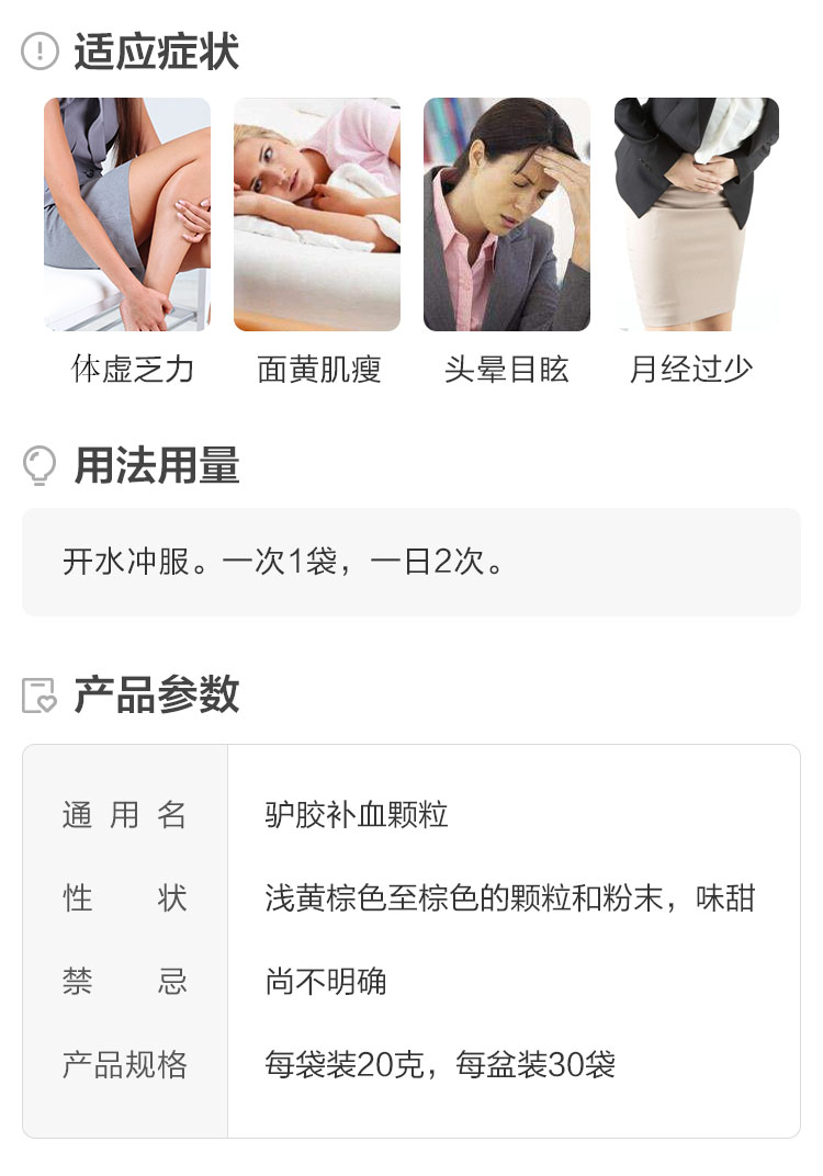 具有滋阴补血、健脾益气的功效,对于久病体虚、血亏气虚、疲乏无力、手术后失血过多等症有显著疗效,男女都可以服用。素有“血中之圣药”的美誉,以驴胶为主药,配以白术、党参、黄芪等健脾益气之品,再辅以当归养血,从而达到气血双补气血足、强身健体精力旺的功效。