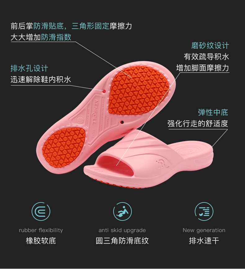 天猫kenroll多边专卖店69元,可领20元优惠券,实付49元到手,科柔的核心卖点是鞋底的防滑贴片,特制橡胶能迅速引导水膜分散,加上前后掌三角形和圆形相间防滑纹路,无论是瓷砖、大理石、油污、沐浴露、洗发水地面,防滑效果都足够好。尤其适合老人小孩孕妇穿。