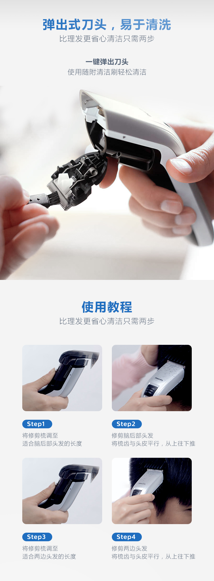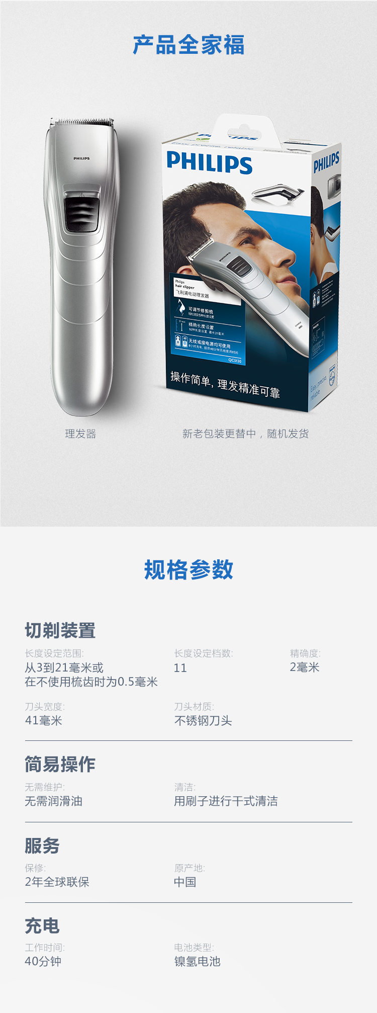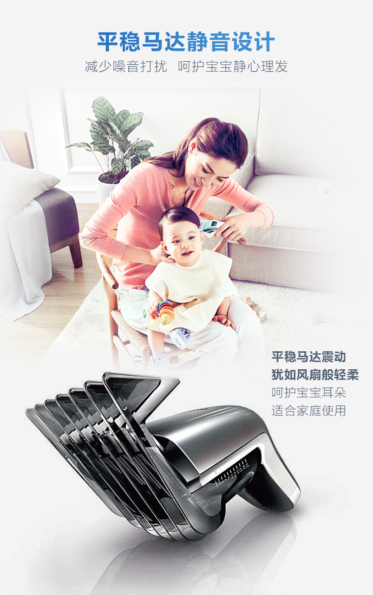 圆形自磨刀片无需上油和日常维护就可以保持长久锋利,顺发梳可防止拉扯皮肤,即使给孩子理发也不用担心损伤到稚嫩肌肤,可以在1–21mm间设定10种长度,精度为2mm,内置充电电池可连续理发35分钟,也可以直接接驳电源理发,电源为100-240V全球自适应电压。