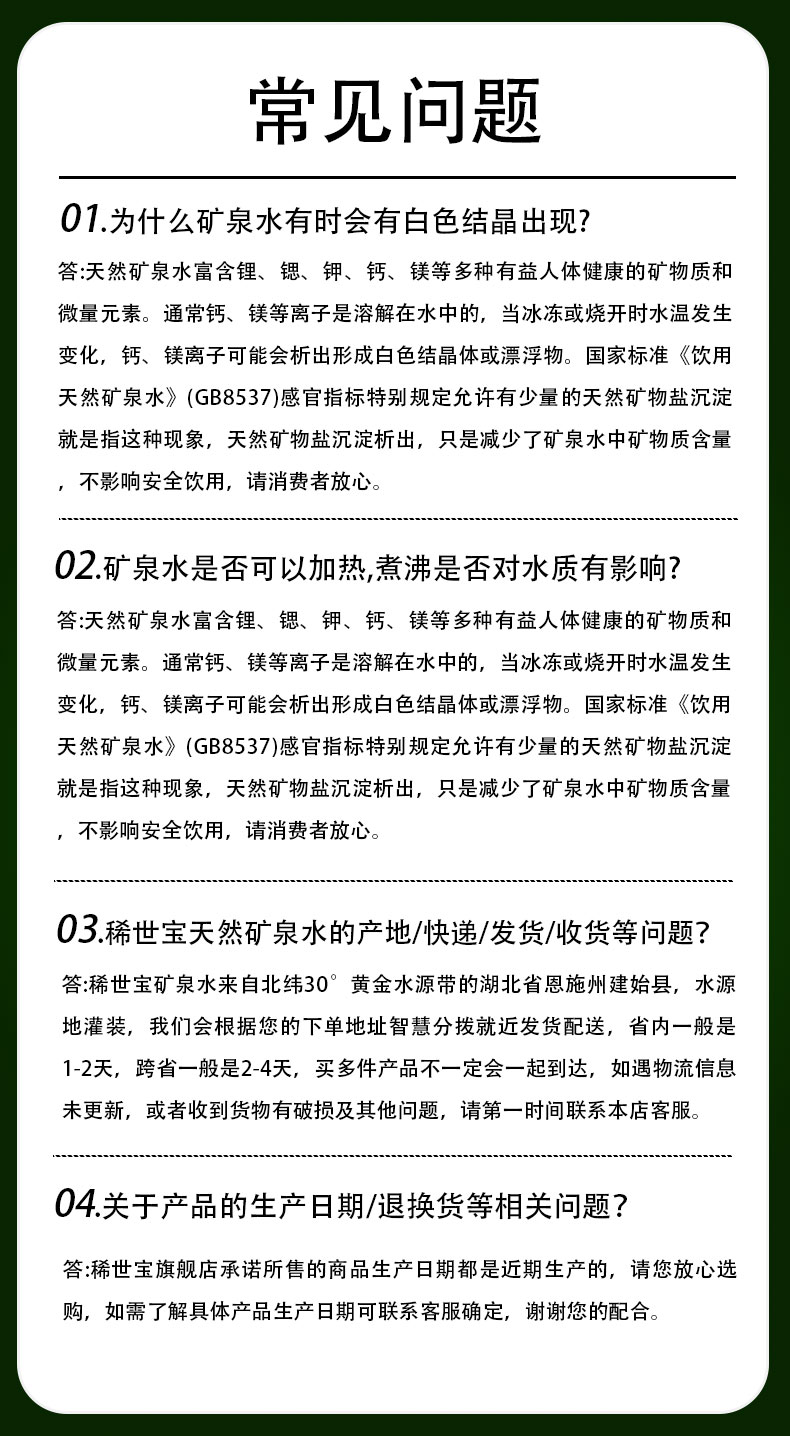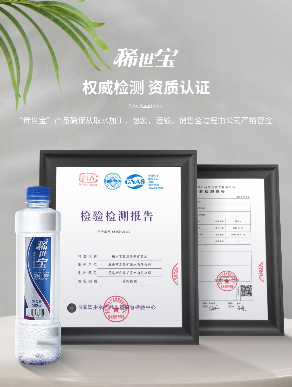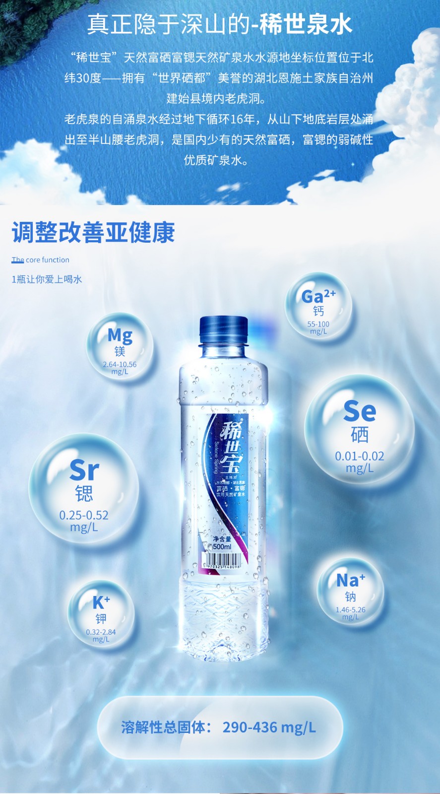 这款稀世宝的水源来自恩师苗族自治州的马栏溪村,被誉为世界硒都,矿泉水来自于万米深层循环16年的老虎泉水,天然矿泉,富含硒、锶、钾、钙、镁等多种人体所需的矿物元素,尤其是硒和锶的含量远超国标,为世界绝无仅有的富硒、富锶矿泉水资源。