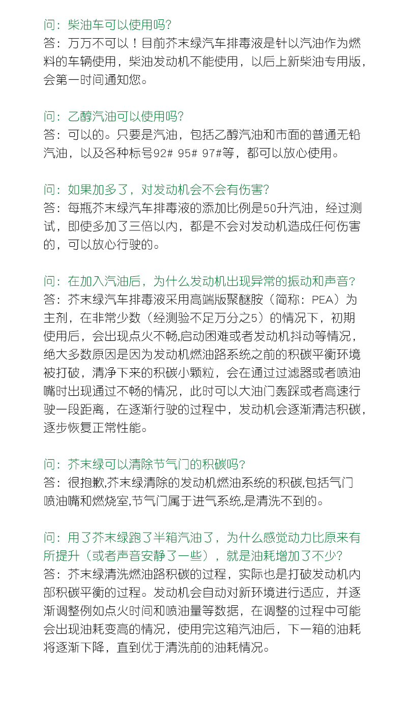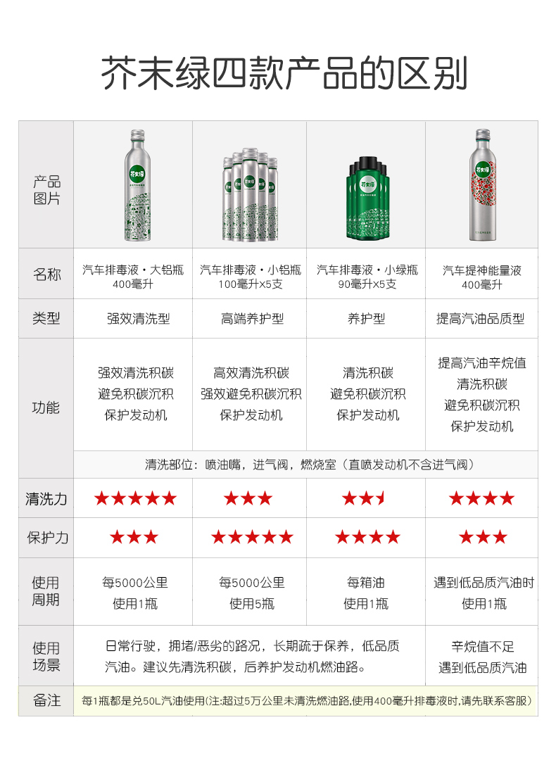 使用方法:每5000公里使用1套,1支芥末绿可以兑50升汽油。
