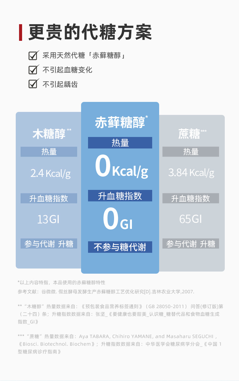 赤藓糖醇的吸收并不影响血浆中葡萄糖和胰岛素水平,这使得赤藓糖醇成为适合糖尿病人食用的甜味剂。赤藓糖醇能量系数为0KJ/g,且不会导致龋齿蛀牙。
