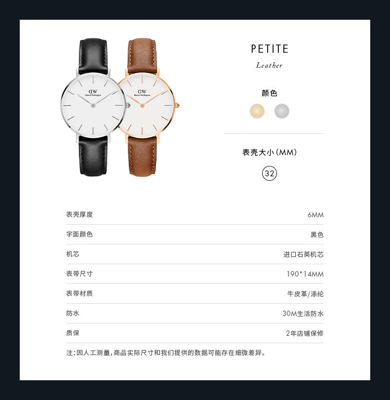 真牛皮表带,宽14mm,便捷针扣设计,针扣上刻有“DW”的LOGO。日本石英机芯,防水30米,精简的北欧风格,经常有明星戴这款出街,之前很火的网剧《盗墓笔记》中,李易峰也有戴着这品牌的手表出镜。