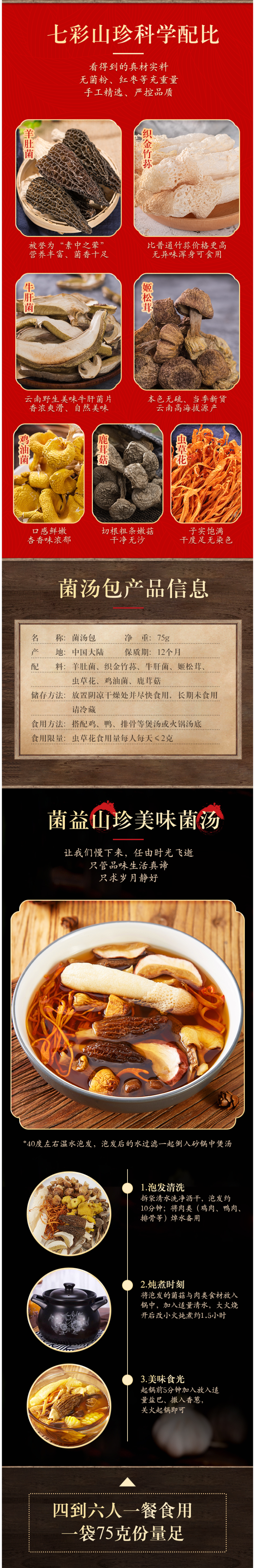 这款菌益七彩菌汤包是一款食用菌菇汤包,精选热销菌菇搭配组合,分别是织金竹荪、鹿茸菇、鸡油菌、虫草花、姬松茸、牛肝菌、羊肚菌,菌味浓郁、汤底清香,入口香醇,营养更丰富。