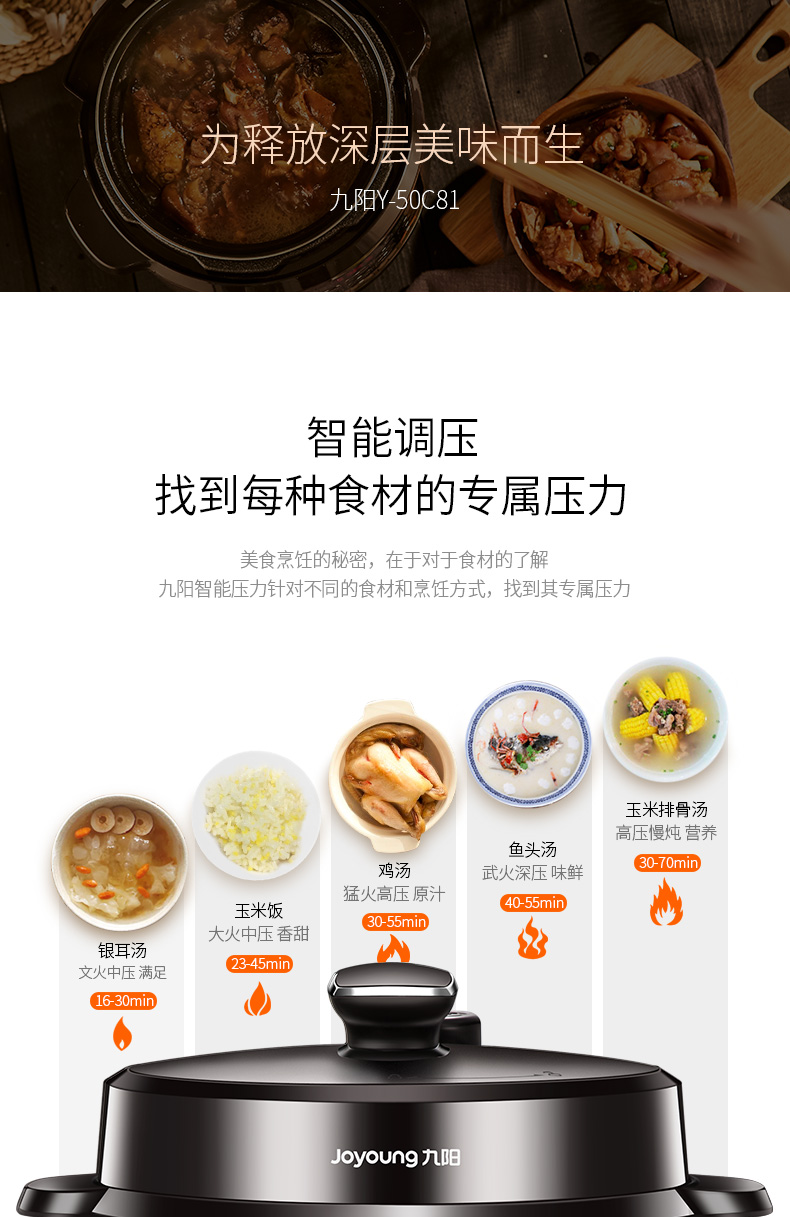 智能8段调压,10重安全防护,自动识别不同食材,释放不同压力进行蒸煮,锁住食材的美味;还有进度显示,烹饪过程,一目了然,还有开盖收汁和一键排气功能;