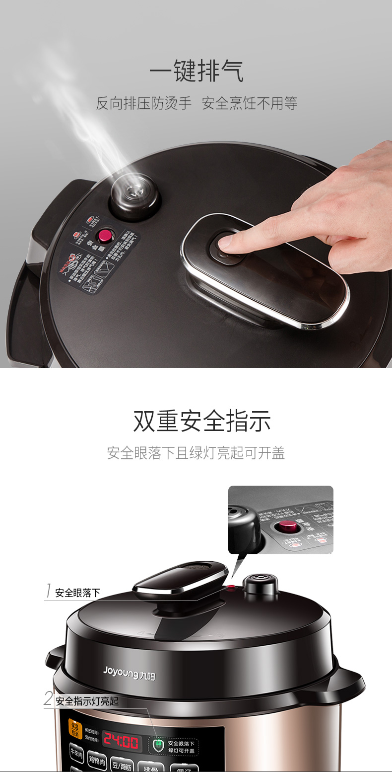 九阳的这款电压力锅,优雅黑和香槟金搭配,带有金属拉丝工艺,更加具有美感,很时尚。触屏大按键面板,有12大常用菜单,标准饭、煮粥、煲汤、排骨、鸡鸭肉、牛羊肉、豆蹄筋、八宝粥、蛋糕;