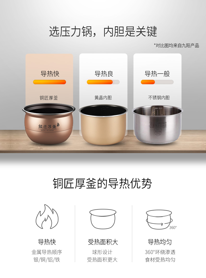 铜匠厚釜:选用导热性更快的铜匠厚内胆,食品级不粘涂层;可以粥饭、蛋糕;