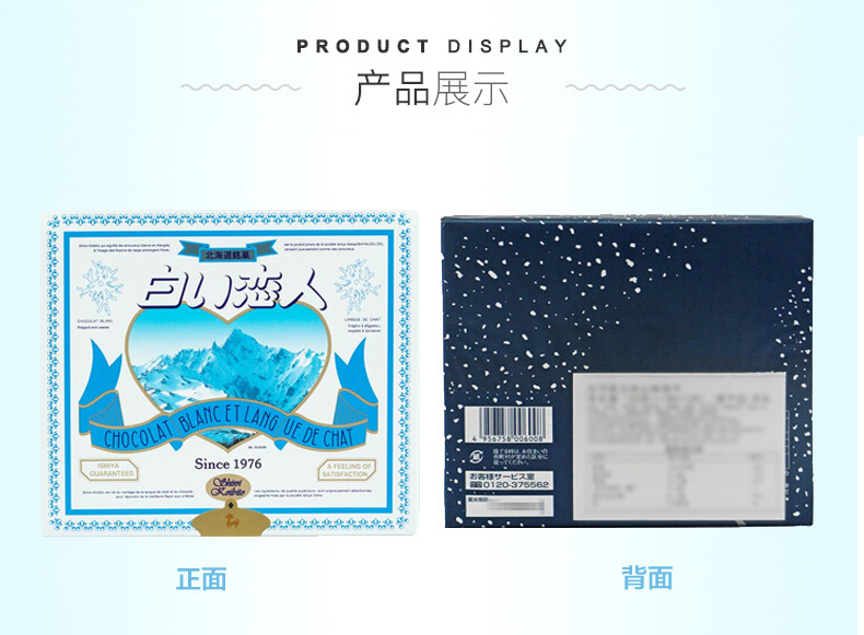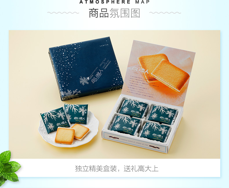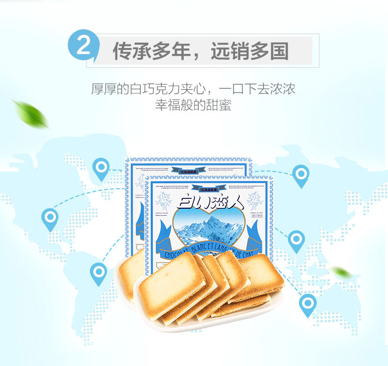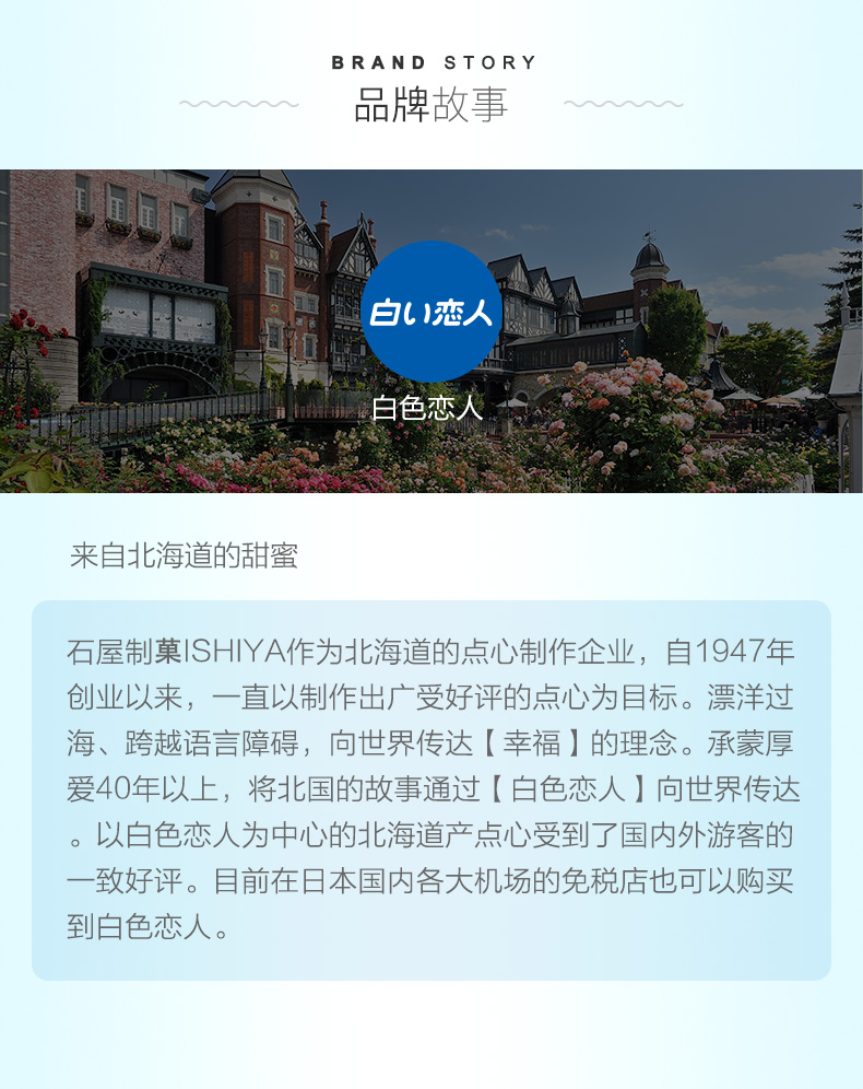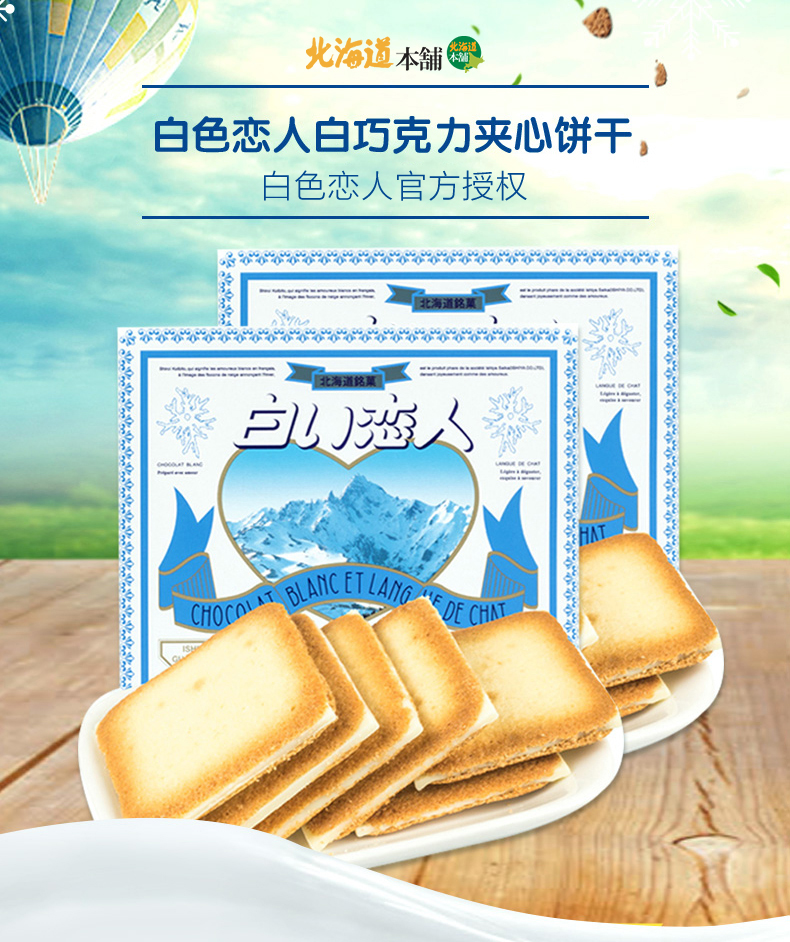 白色恋人(しろいこいびと),是北海道札幌市的石屋制果株式会社出产的一种巧克力夹心薄饼。它由两片薄饼(法语:langue de chat)中间夹白色巧克力的「白い恋人ホワイト」,包装是由白色和水色为基调的设计,中间配以利尻岛的利尻山照片。