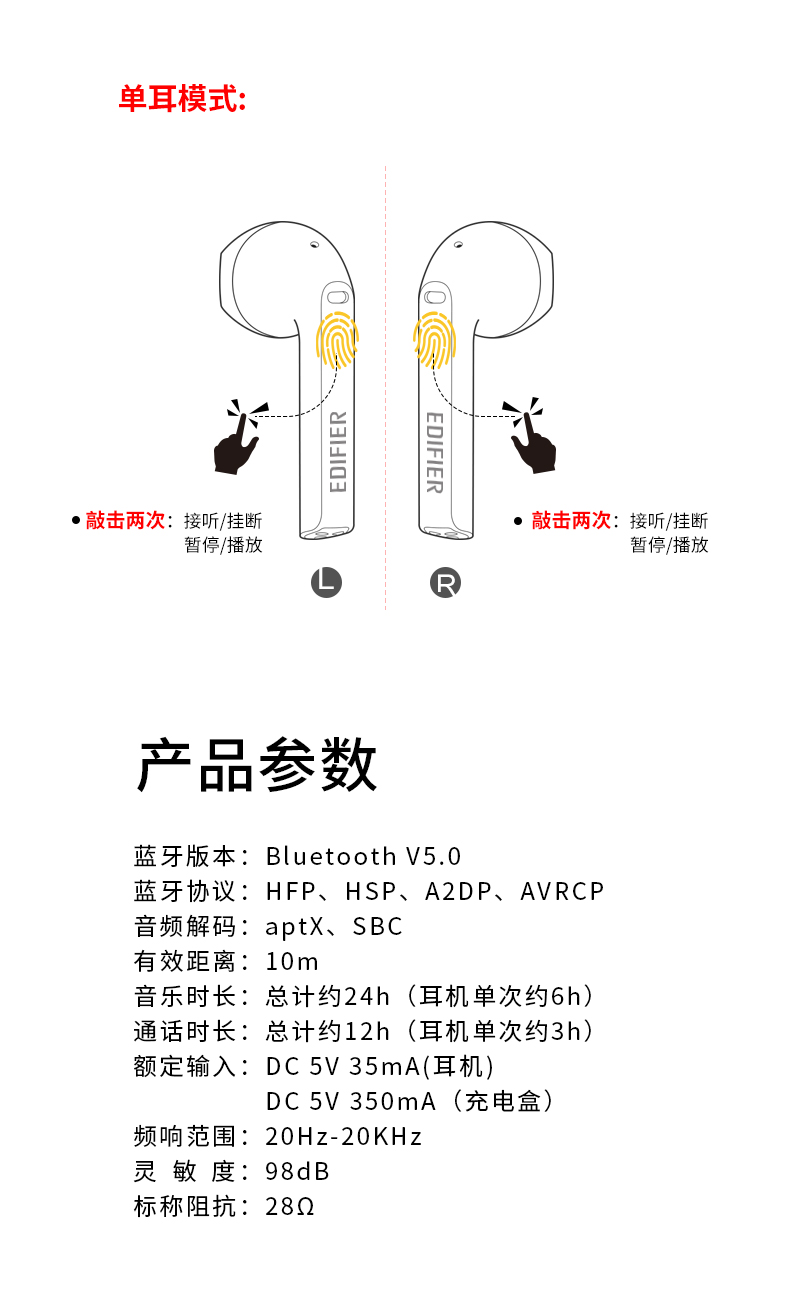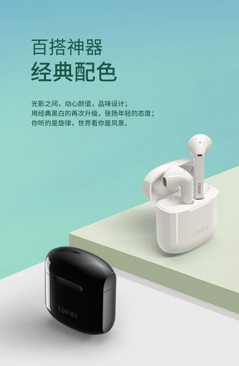 3D人体工学开模设计,曲面入耳,适合于绝大多数的耳型,单次续航6小时,耳机盒还能提供18小时的续航延长,无需担心电量问题,音质方面,使用生物振膜,结合漫步者多年的声学经验,三频均衡,还有IPX4级防水,可应对户外雨水和汗水的冲击。