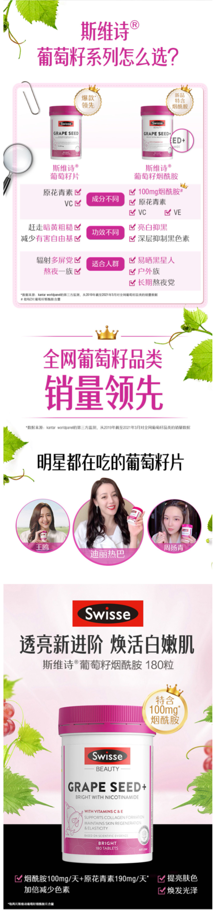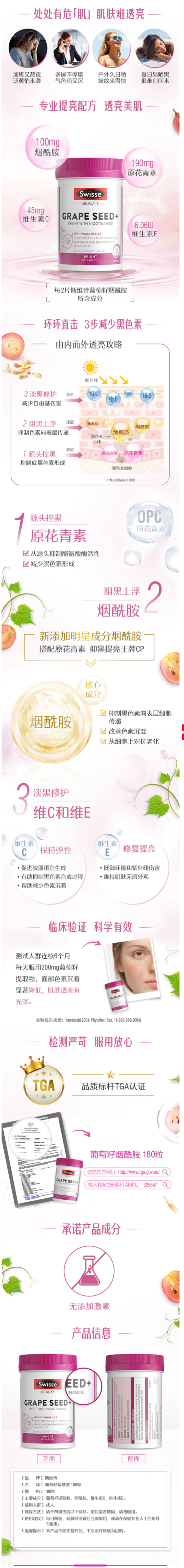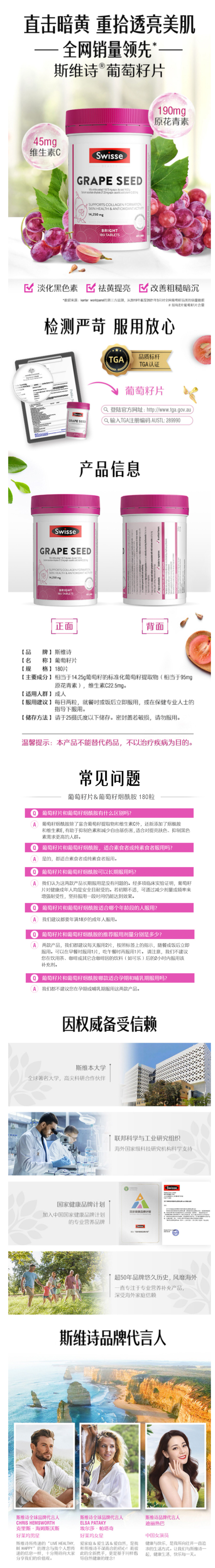 这款Swisse 葡萄籽片,澳大利亚原装进口,精选高含量葡萄籽多酚的优质葡萄,高吸收利用率,超强抗氧化,有助于推迟或减少色斑、皱纹的出现,减轻辐射对皮肤的影响,爱美的女士、长期对着电脑、熬夜的上班族都可以尝试一下。
