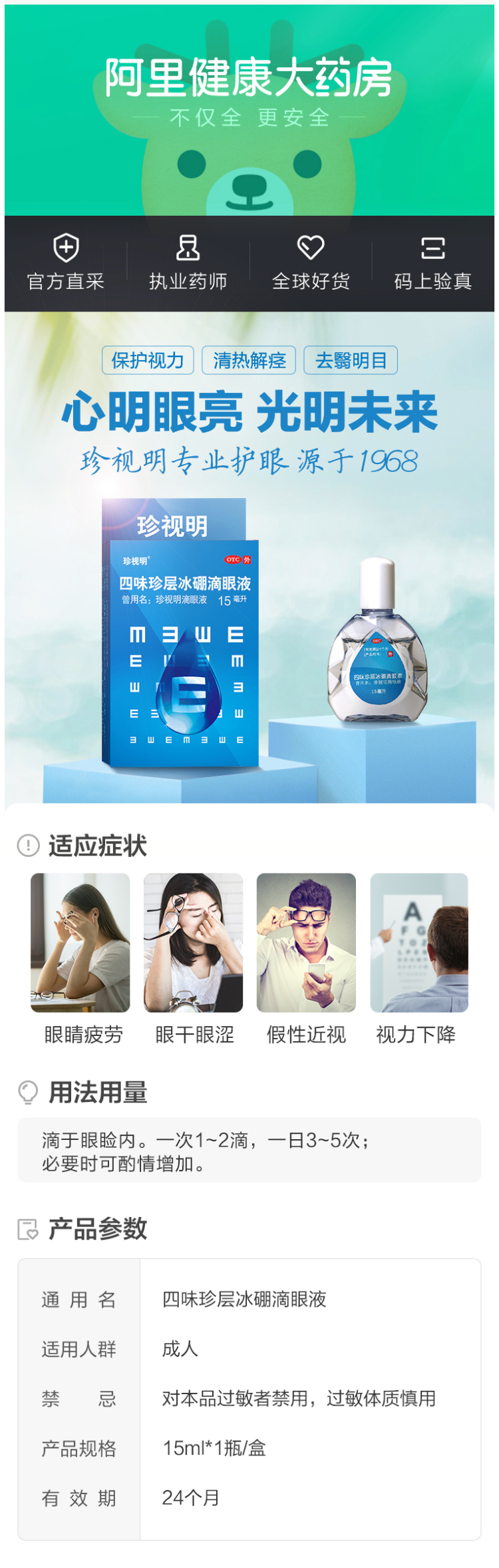 珍视明滴眼液,主要用于日常护眼,缓解眼疲劳、干涩胀痛、预防青少年假性近视,尤其适合长久盯着屏幕的上班族,用于肝阴不足、肝气偏盛所致的视力下降等。