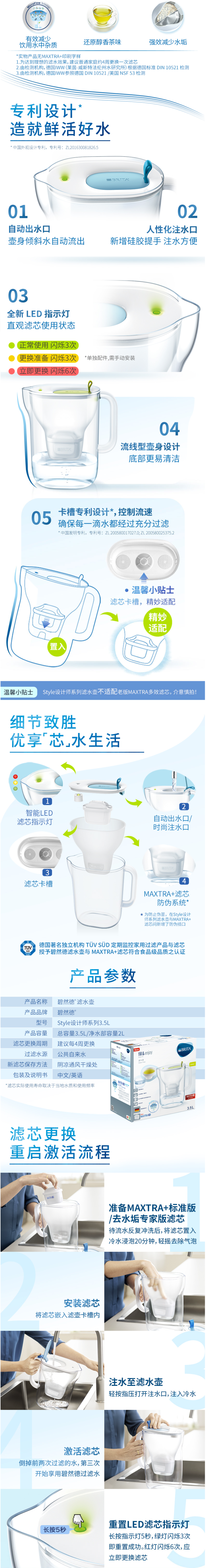 德国的Brita碧然德是过滤水系统行业的领头羊。这款碧然德 Style设计师系列的净水壶,是2017年红点奖作品,颜值比普通系列高很多,搭配的也是去水垢加强版滤芯。据网友反馈,壶身比经典款的薄、软,滤芯是国产的。