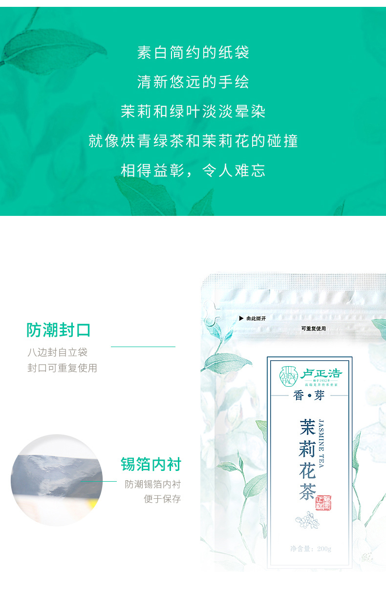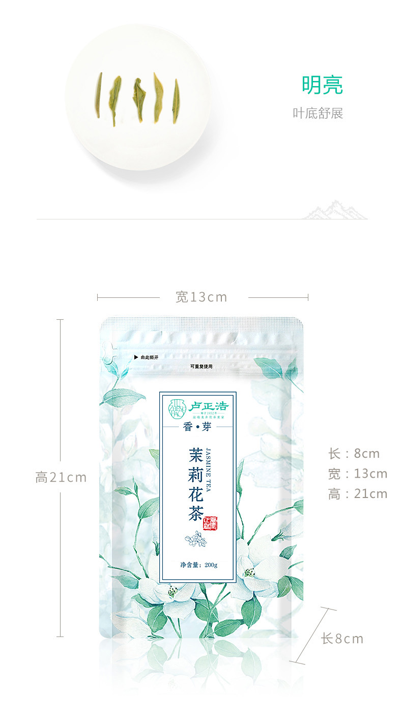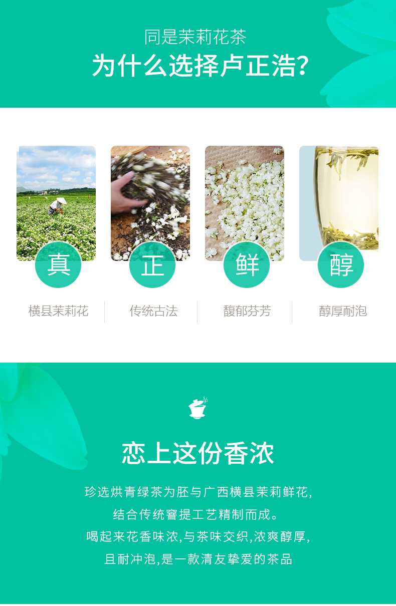 卢正浩茉莉花茶,珍选烘青绿茶为胚,搭配广西横县的茉莉鲜花,结合传统窨提工艺精制而成,喝起来花香味浓,与茶味交织,浓霜醇厚且耐冲泡,茶叶紧结重实,白毫显露。
