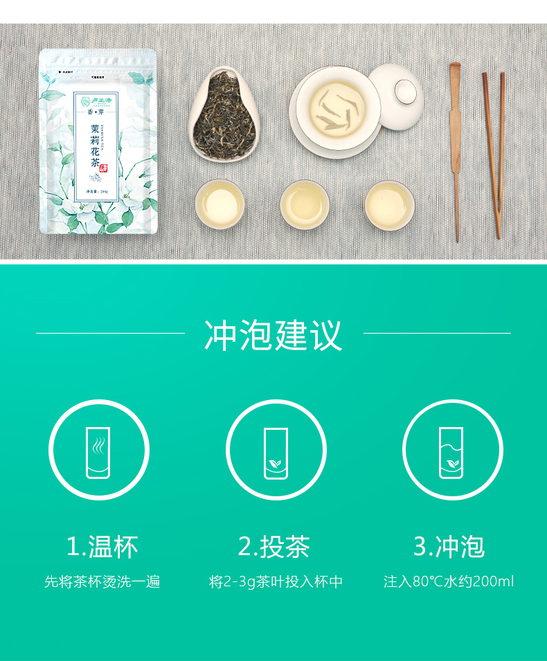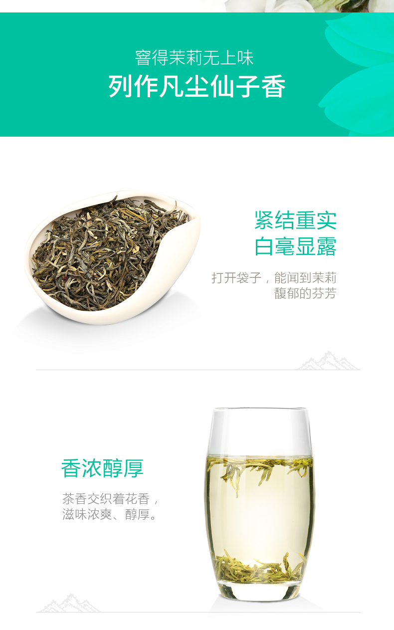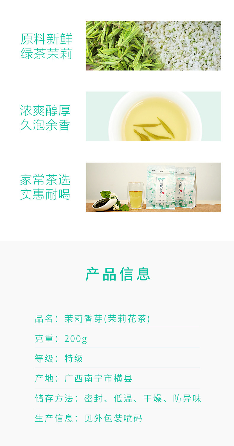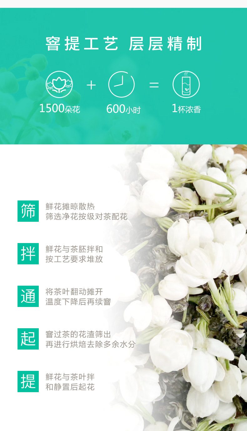 卢正浩茉莉花茶,珍选烘青绿茶为胚,搭配广西横县的茉莉鲜花,结合传统窨提工艺精制而成,喝起来花香味浓,与茶味交织,浓霜醇厚且耐冲泡,茶叶紧结重实,白毫显露。
