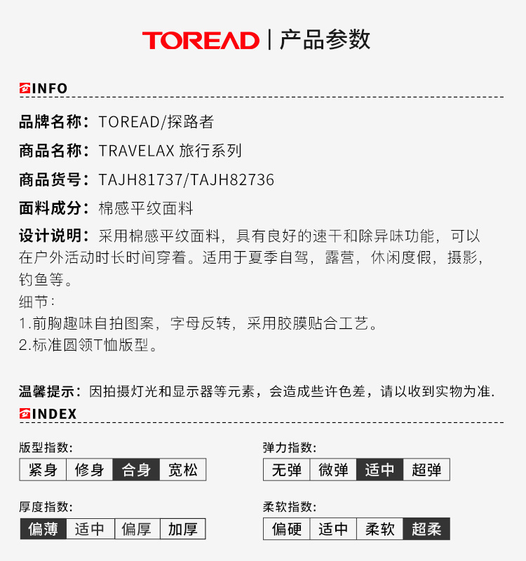 这款探路速干T恤,使用棉感平纹面料—100%聚酯纤维,摸起来手感接近纯棉,穿着更舒适。功能上吸湿排汗,速干透气,适用于夏季或运动时穿。