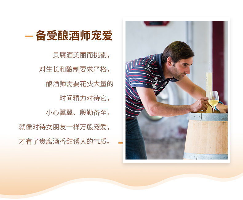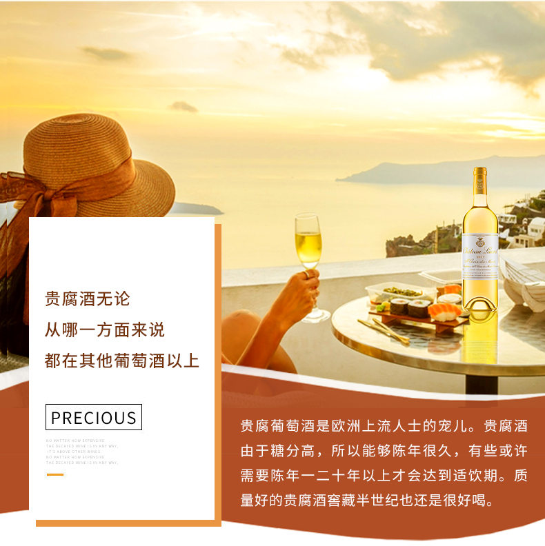贵腐酒是甜白葡萄酒中最为高贵的一种。呈现出一袭美丽的金黄色酒裙,具有槛椁果冻、蜂蜜及奶油面包香气,口感丰润散发出雅致的烘焙气息。有着“液体黄金”之称,又有“酒中之王,王者之酒的称号”。
