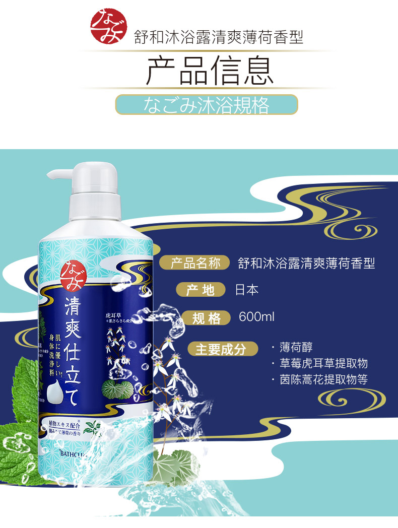 这款 巴斯克林 舒和森林沐浴露600ml,日本原装进口,采用含有虎耳草提取物、茵陈蒿提取物、维生素C等植物、薄荷提取物等植物性草本原料,松软轻柔的泡沫和温和宜人的使用感,泡沫细腻,易于冲洗,使用后舒适不黏腻,肌肤柔润透亮。