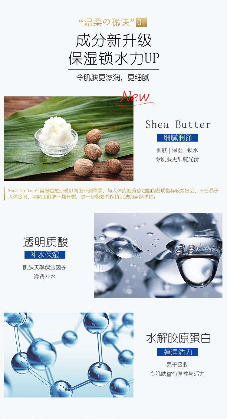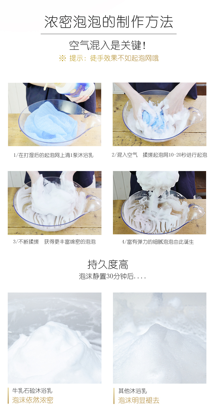 添加的牛乳精华与胶原蛋白及透明质酸,能滋润嫰白肌肤并可清除毛细孔内的污垢与角质,使肌肤晶莹剔透,含有甘草保湿成份,洗后不干涩紧绷,不黏腻好冲洗。