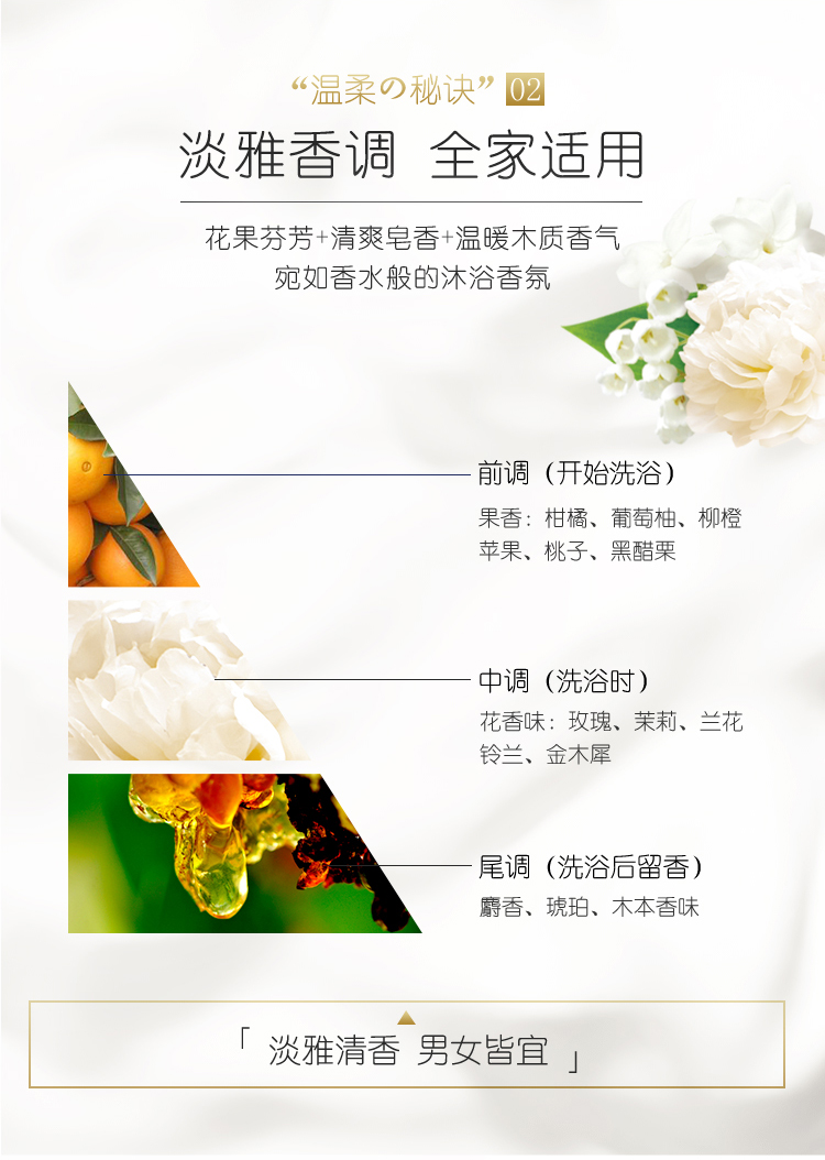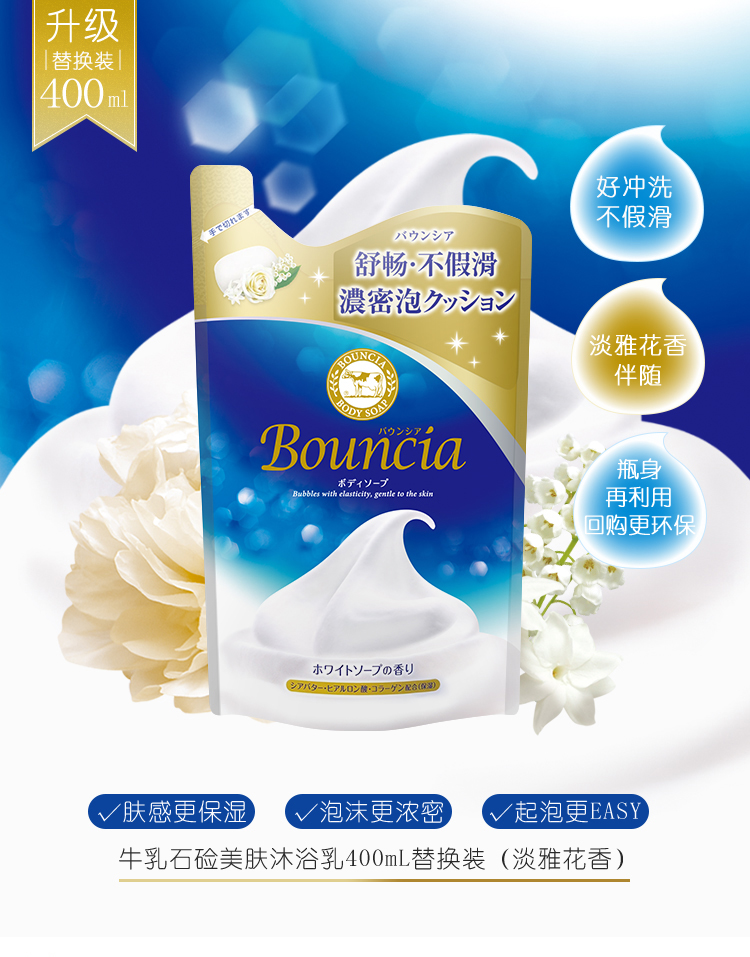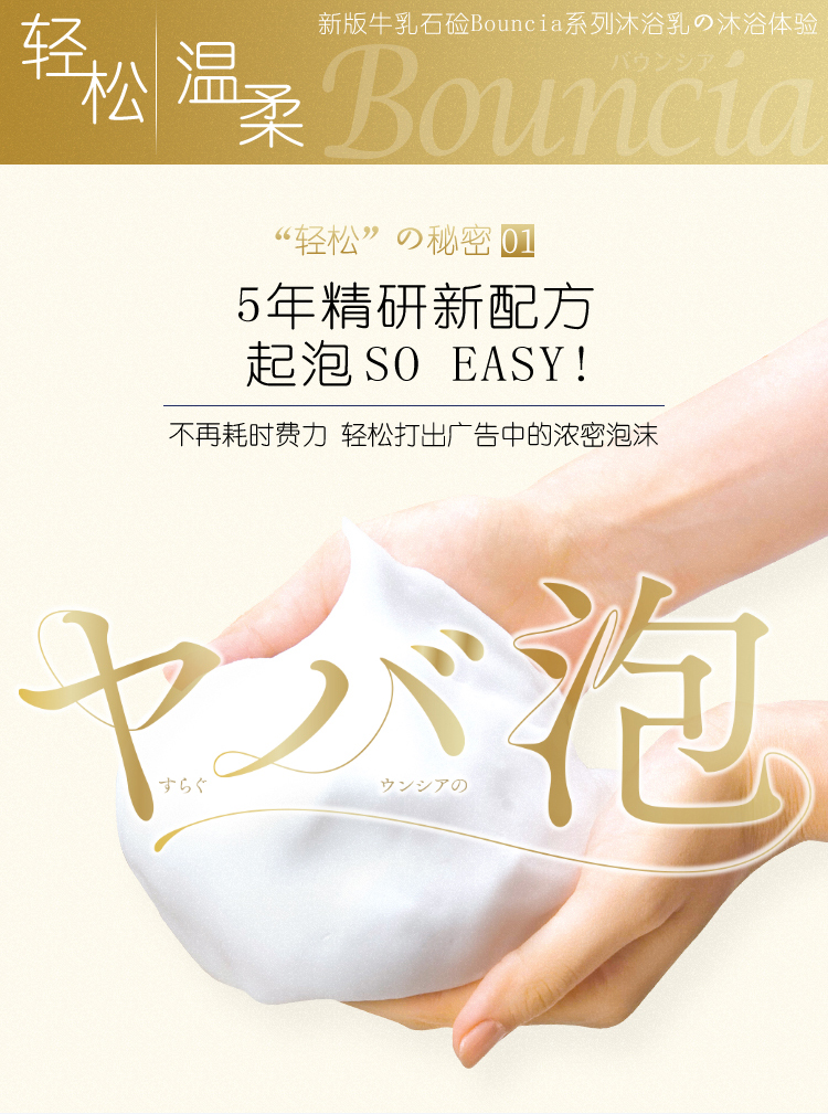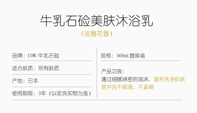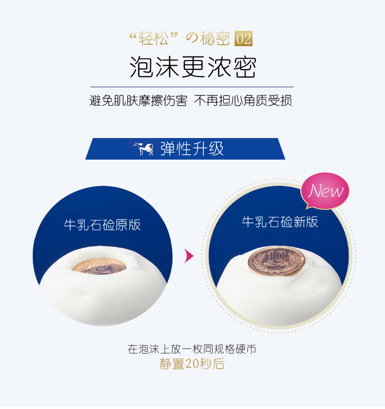 承袭牛乳石碱百年独特釜顶制法,采用植物性石碱素材,成分天然温和,添加了三种美肤成分:胶原蛋白、尿玻酸、牛奶蛋白,深层滋润肌肤,保持沐浴后的肌肤光滑柔嫩。