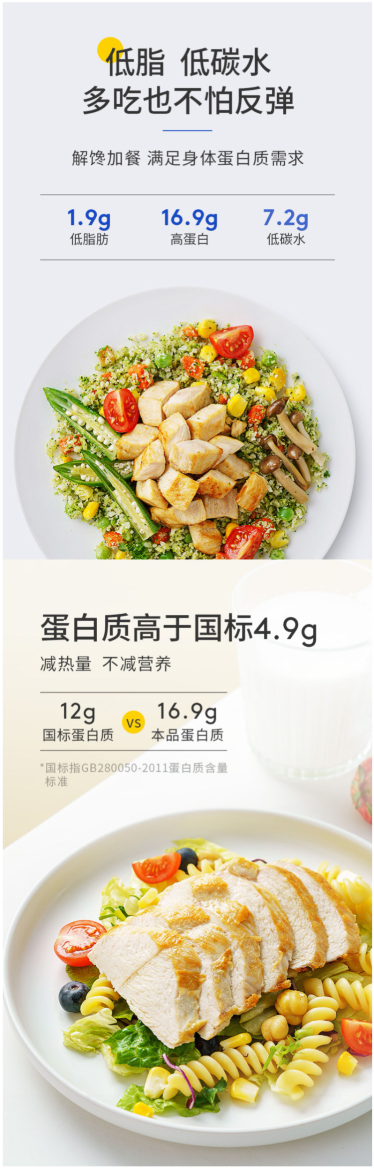这款小牛凯西香煎鸡排是半成品,回家煎炸一下即可食用,无需再加任何调味。选取饲养过程中不使用激素的鸡,0激素成分,不添加嫩肉粉,去皮去油脂,制成过程中也不额外添加油脂,单片含1.9g低脂肪、16.9g高蛋白,7.2g低碳水,360°真空滚揉嫩化,独立包装。