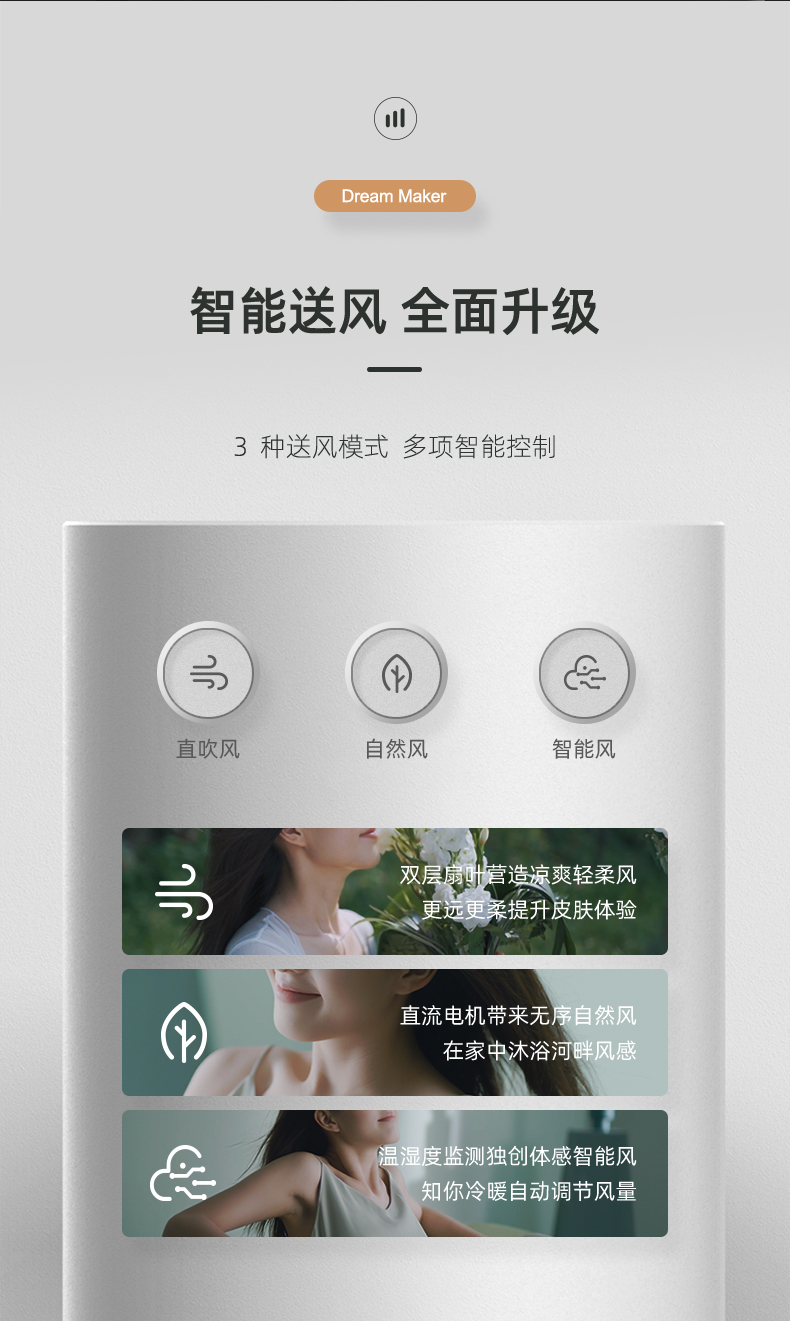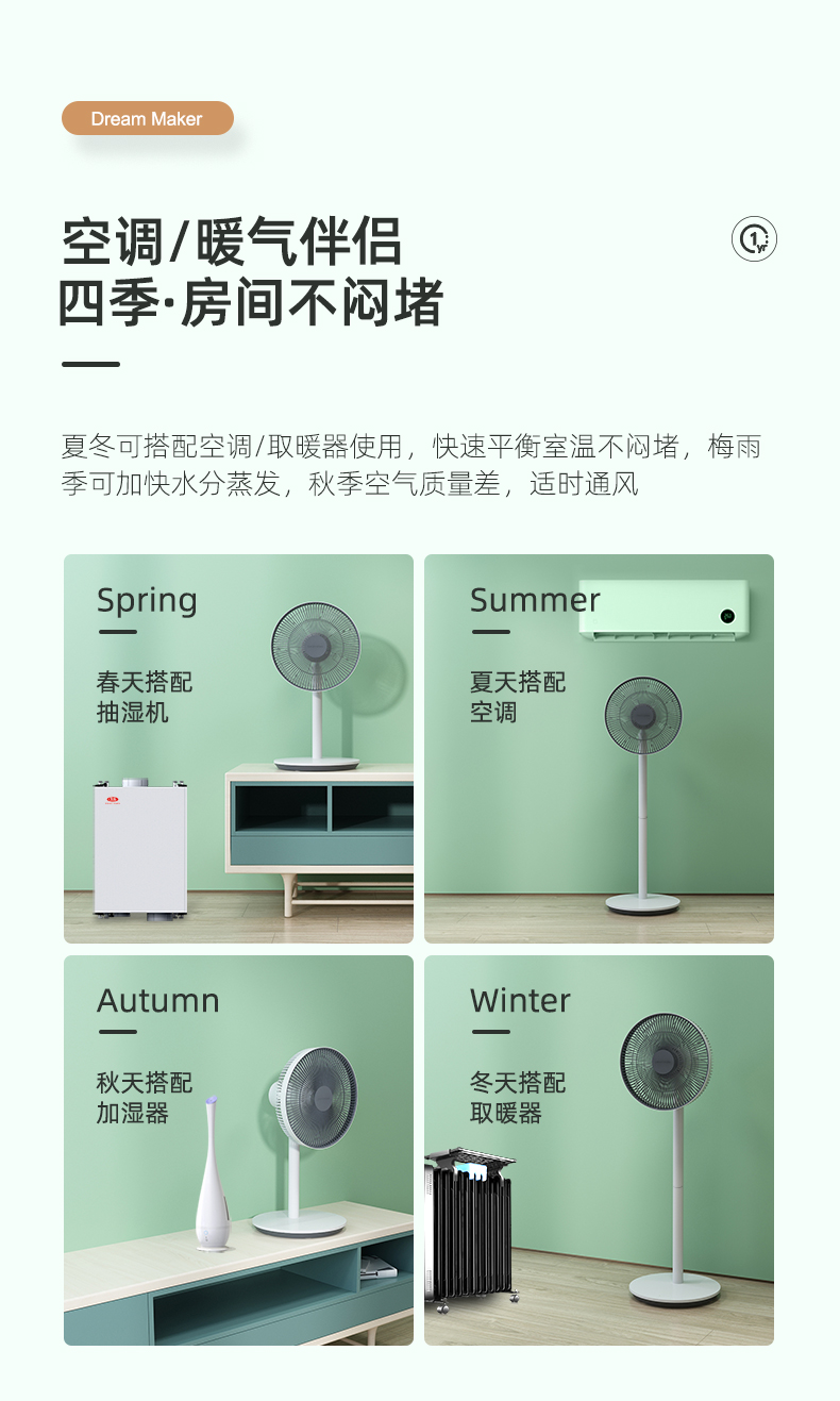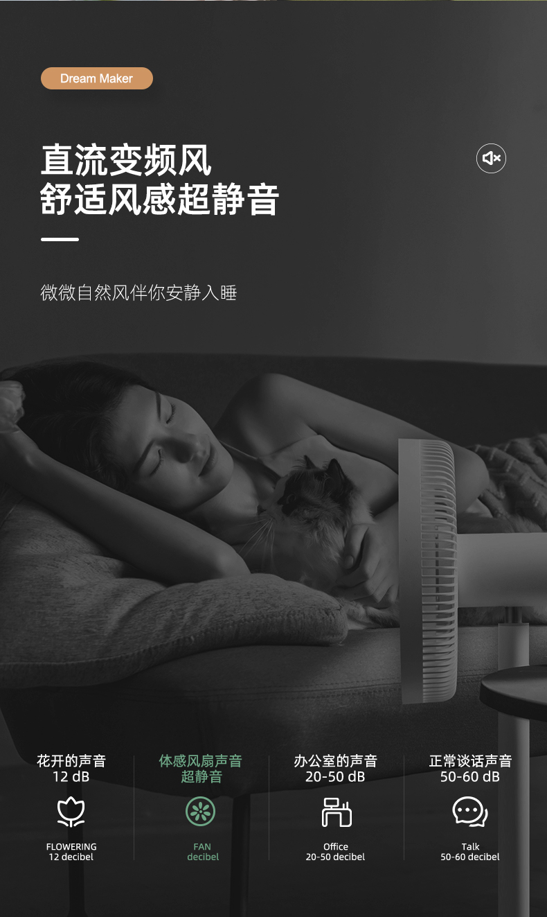 采用先进的直流变频电机,可实现细腻的100档无极变频,兼顾静音与低功耗,可通过内置传感器,风扇可以实时监测室内温度、湿度,让风速随着体感温度自动调节,时刻保持风感舒适,送风距离可达14米。
