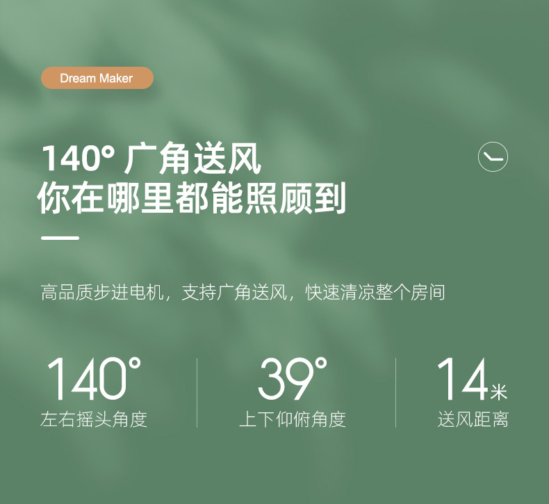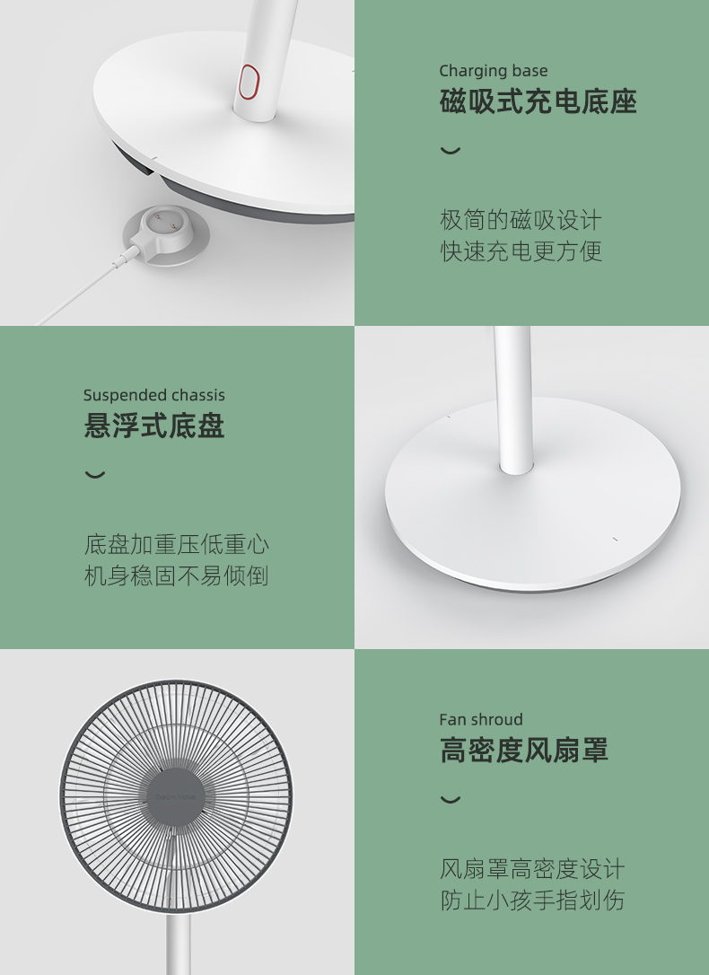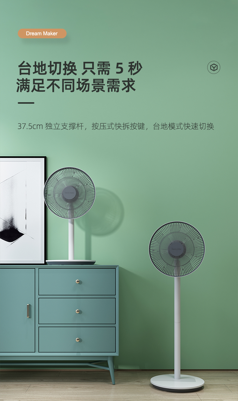 细节上:风扇采用双层翼型羽叶,利用双层羽叶间的风速差异,将风汇于一处,打散风中固有的气旋,实现超柔出风质感,久吹不头疼。140°自动摇头,还可上下手动39°调节,广域送风快速清凉整个房间。37.5cm独立支撑杆,按压式的快拆按键,台地切换只需5秒,满足不同需求。