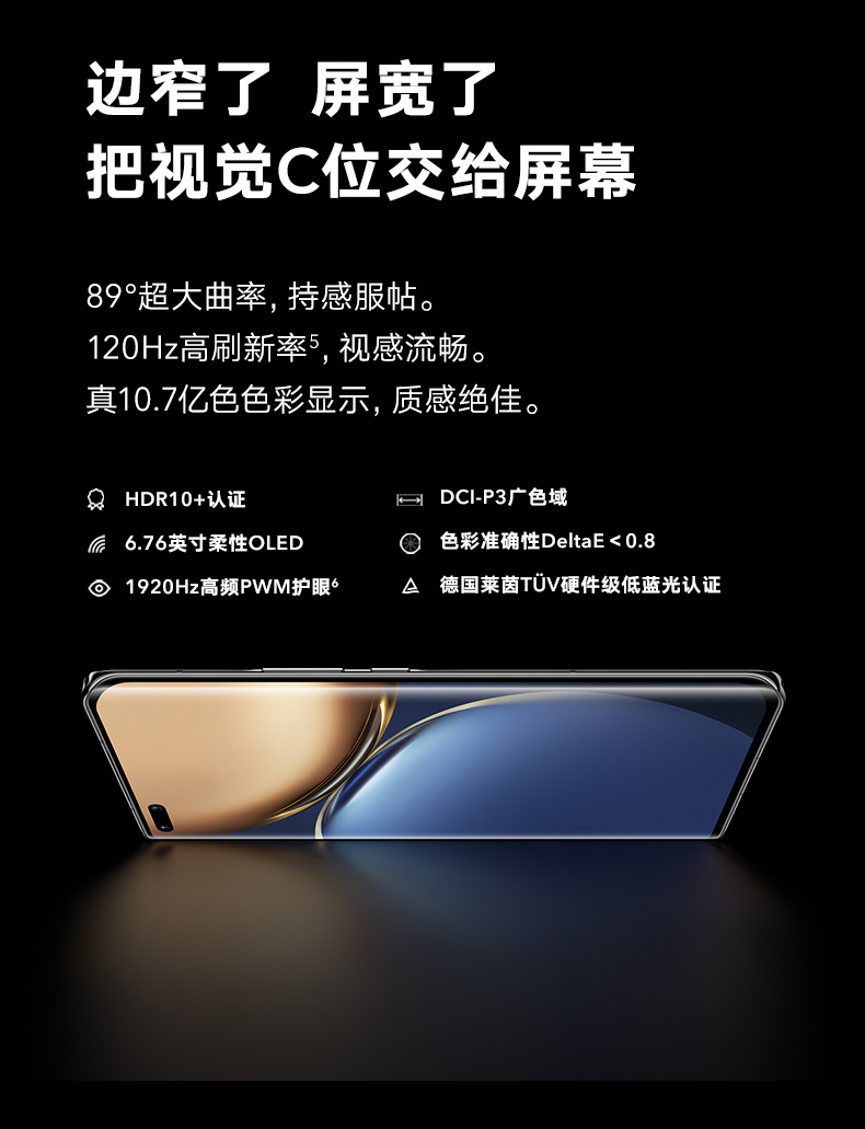 屏幕方面,Mgic3 Pro采用一块6.76英寸89°曲率曲面屏,0.55mm极致窄边框。10.7亿色原彩显示,120Hz高刷新,10亿色显示,100% DCI-P3色域,DeltaE小于0.8,支持HDR10+显示,屏幕显示效果出色。同时,还支持1920Hz高频PWM调光,拥有4096级亮度调节,并通过TUV低蓝光认证。