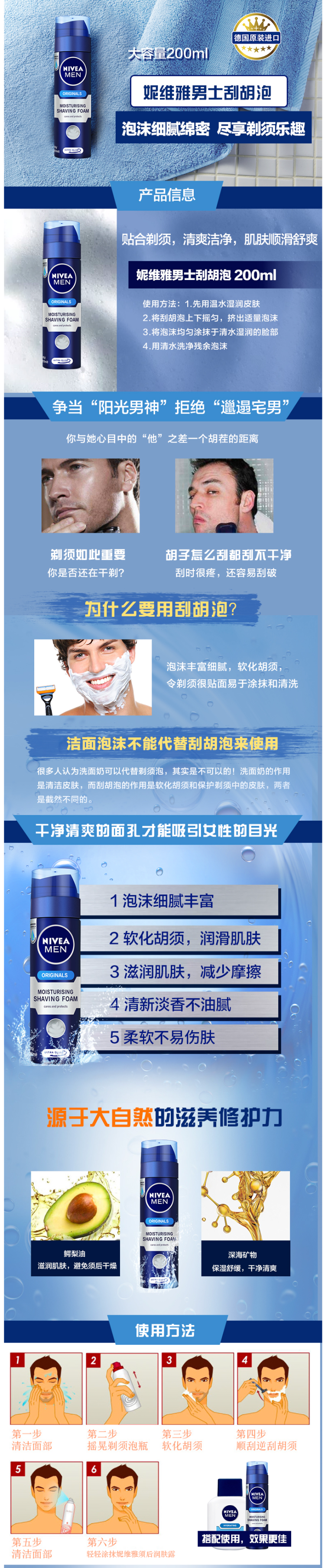 妮维雅男士刮胡泡特别添加鳄梨油滋养成分,剃须后肌肤不觉干燥紧绷,备受滋润,有助于舒缓剃须后紧绷感和刺痛不适感。德国制造,品质的保证。