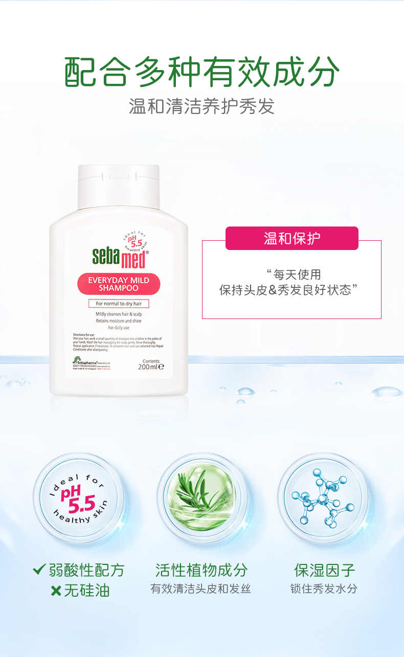 这款德国进口Sebamed 施巴 温和洗发液,规格:200ml,比之前推荐过的修复型洗发液性质更为温和,含水润活性成份,能温和的清洁头发,保质头皮及头发的水分平衡,即使每天使用,也不会对头皮和头发造成伤害。在清洁头发的同时,照顾头皮肌肤健康,不含皂碱,不产生皂垢,温和不刺激,有效防止脱发,PH5.5配方,洗后清爽不油腻。