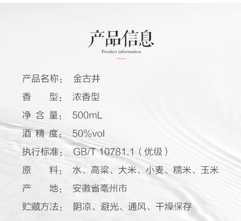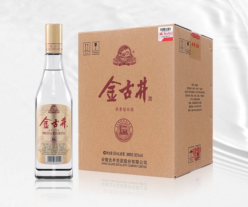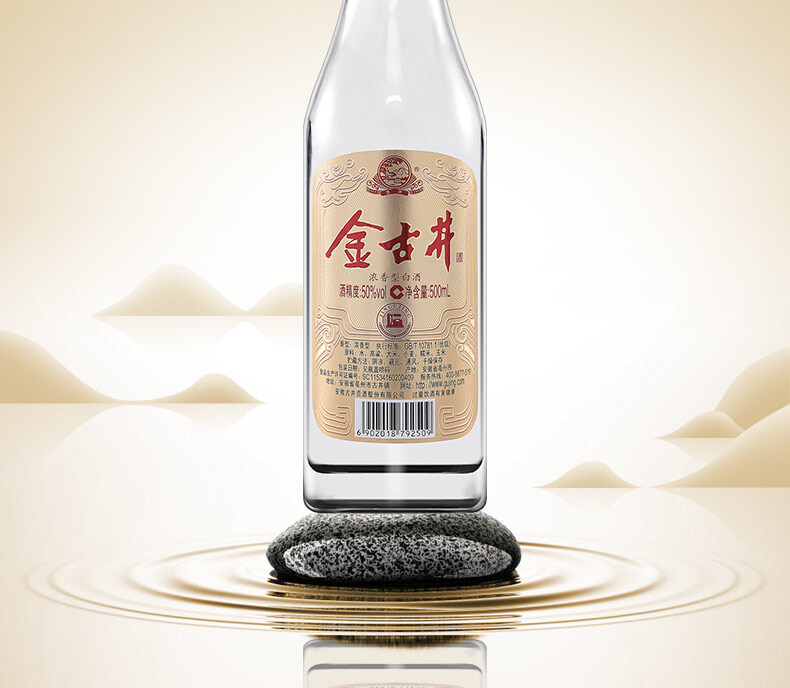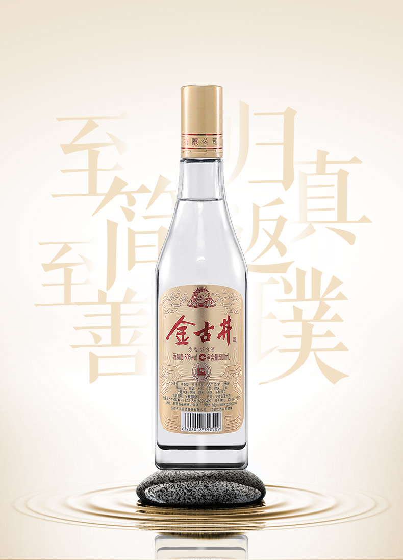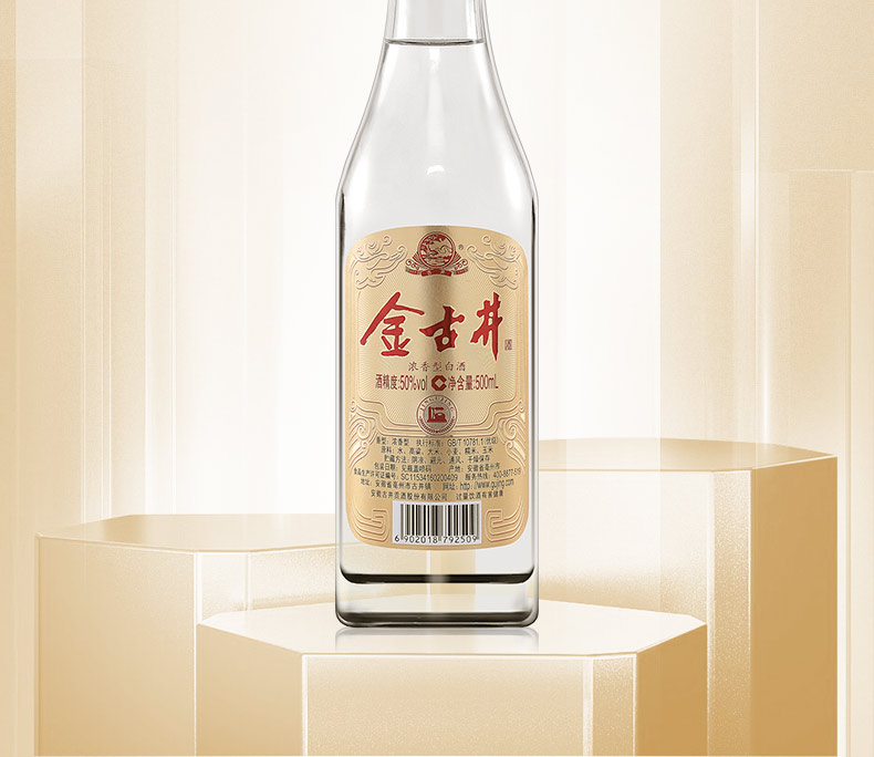 这款纯粮光瓶 金古井白酒属于浓香型固态法白酒,即纯粮食酒。外观:透明玻璃瓶体加复古烫金瓶盖,精简低调更立体,更古拙。酒体醇厚口感丰盈;酒花绵密,余味悠长;酒线莹润,清澈透明。执行标准采用GB/T 10781.1属于国家标准优级,酒精度:50%vol,原料:水、高粱、大米、小麦、糯米、玉米。