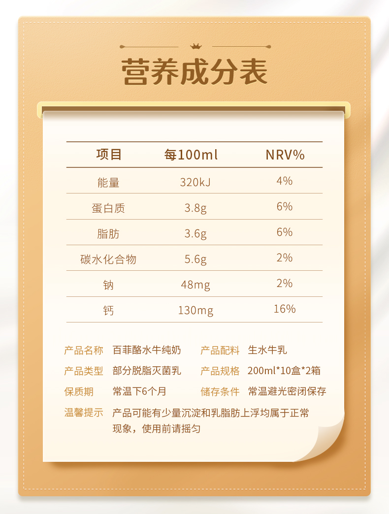 水牛纯奶是普通奶牛产量的1/4,双倍的营养,1/5的胆固醇,再加上比普通牛奶更多的蛋白质、钙、氨基酸和微量元素等,绝对的奶中珍品!
