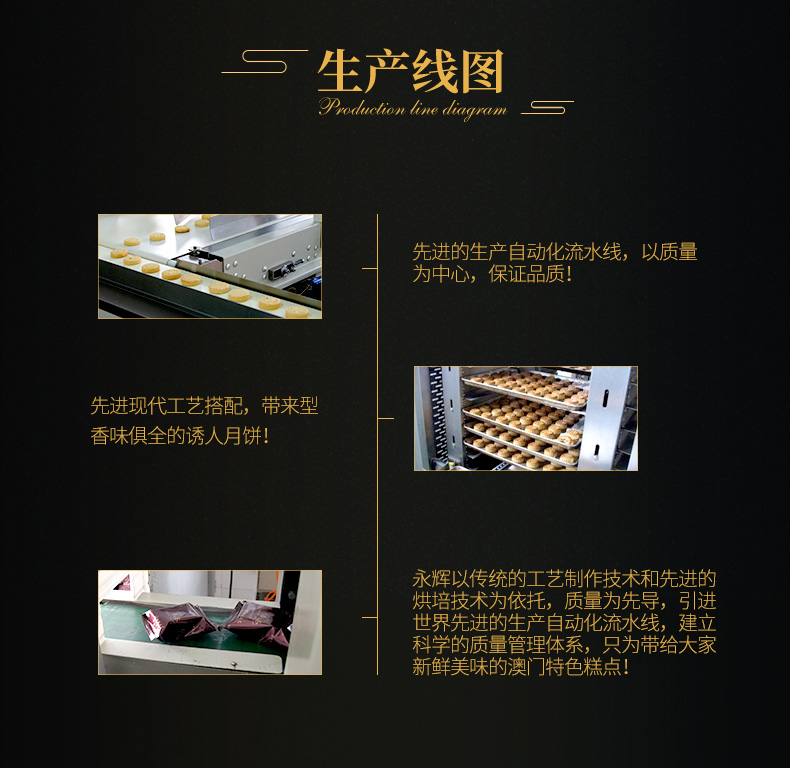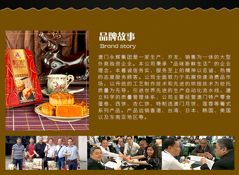 澳门永辉始创于80年代,是来自澳门手信老字号的代表,是传统特色产品的产销一体化企业,80年代初首创椰汁蛋卷皇、紫菜肉松凤凰卷、粒粒杏仁饼并延续至今。澳门永辉初创时,专供澳门各大手信饼家及超市,是澳门首家蛋卷、西饼OEM供应商,专业生产澳门特产。