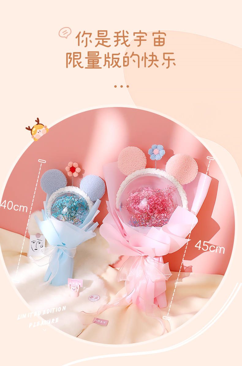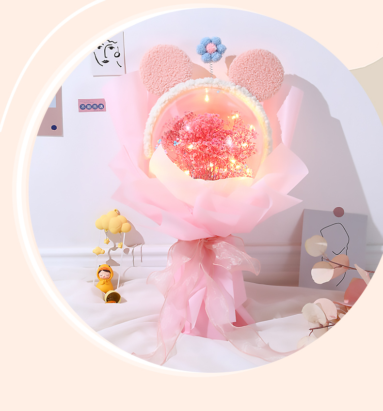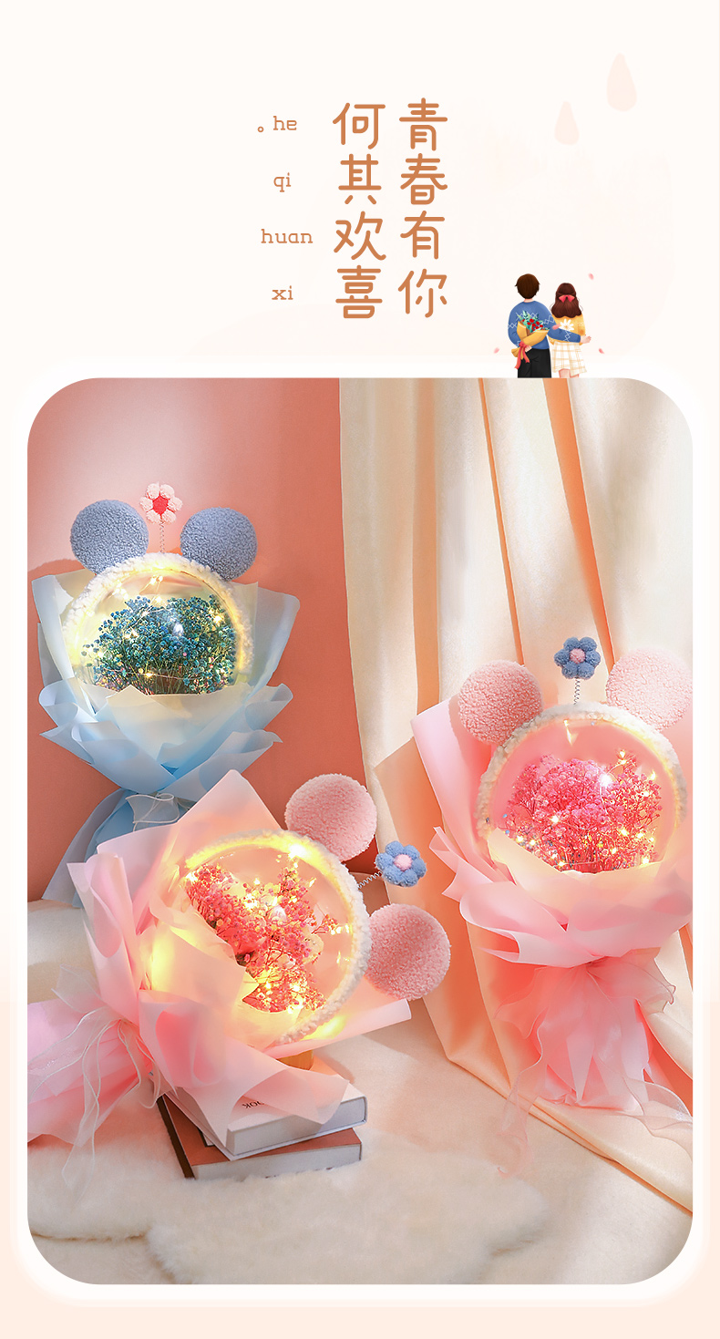 满天星米奇创意永生干花束,大号led灯串在球的里面,打开开关即可点亮星球啦,赠礼袋+贺卡+LED灯。
