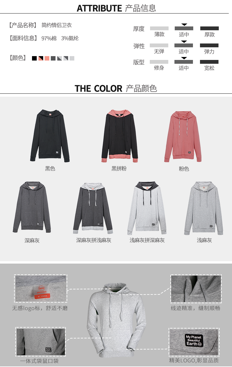 在款式上,是经典袋鼠兜连帽设计,除了纯色款还有拼色可选,我个人比较喜欢「浅麻灰拼深麻灰」,灰色比较百搭,也可作为情侣装。尺码为男女同款,按身高建议选择即可。