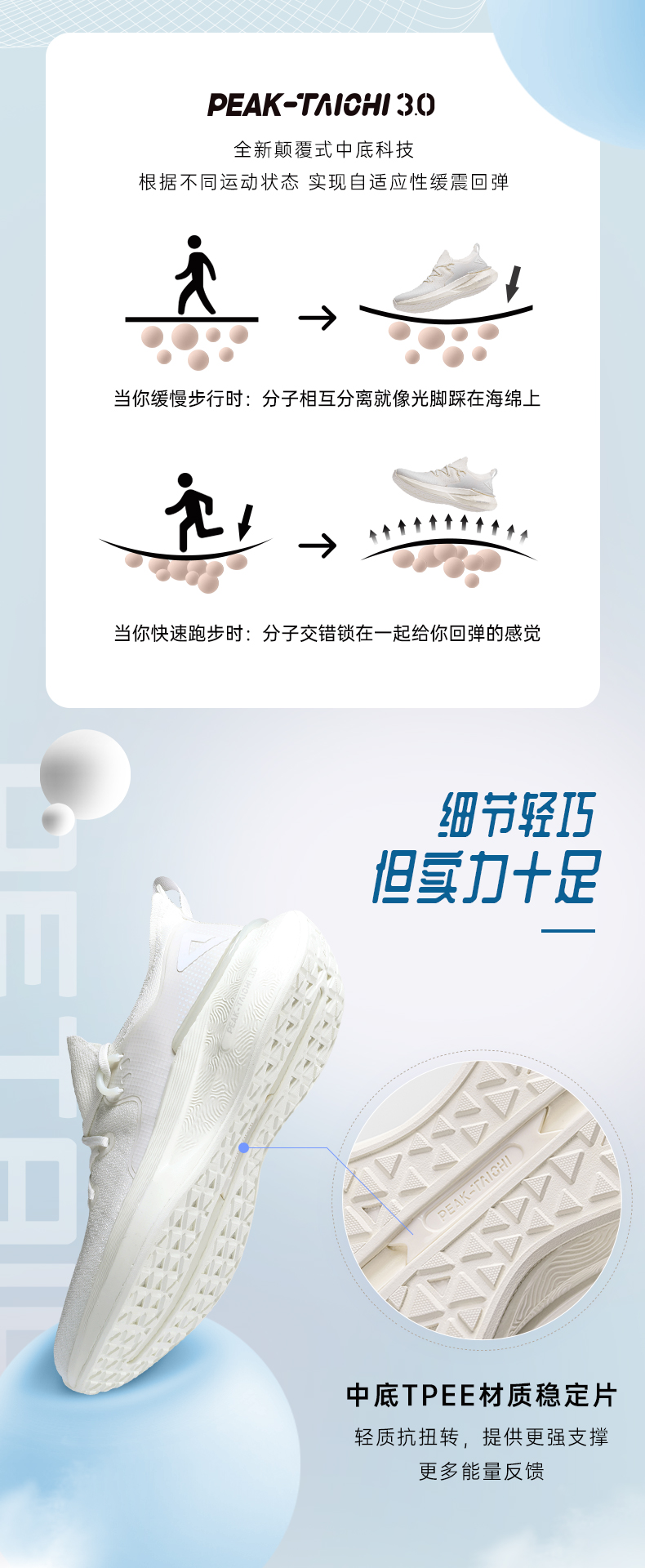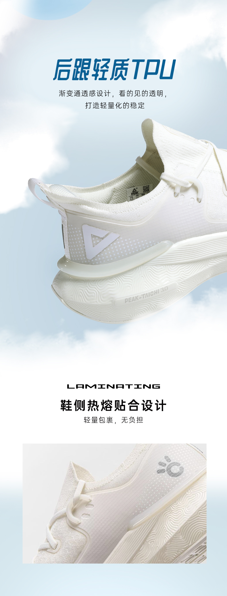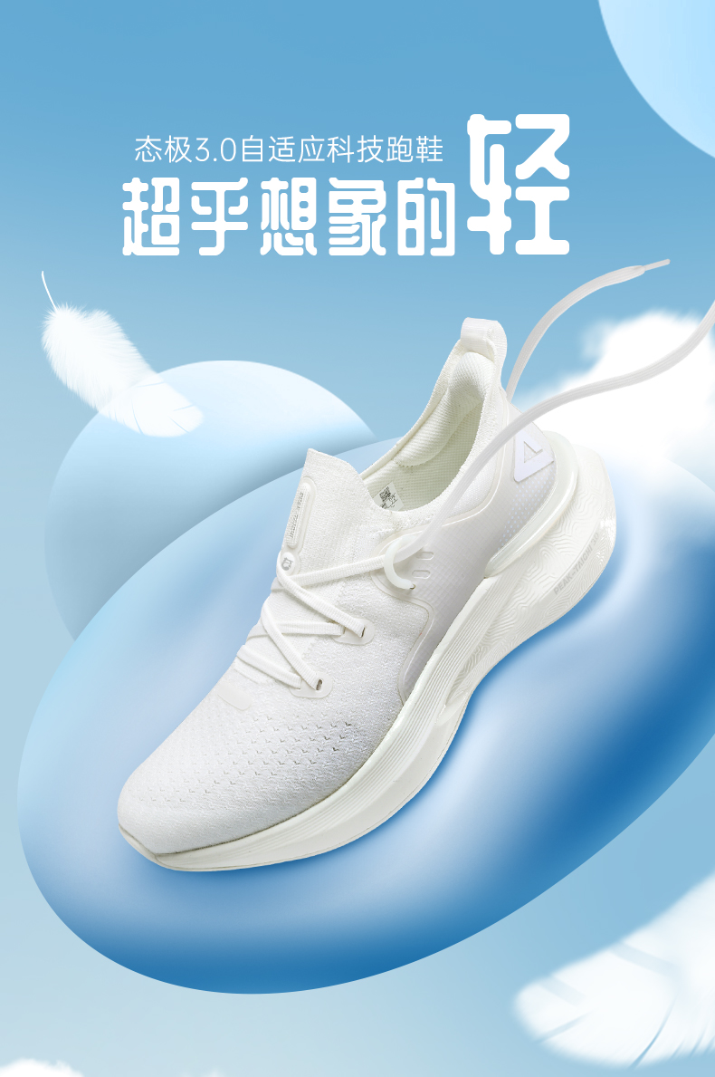 在20年12月28日匹克首发了态极3.0,这次的最大升级就是“轻”,在保留中底的舒适性和鞋身的包裹性后,做到了匹克能做到的最轻,单只重量295g,相比于上代的重量降低了25%,更轻更舒适,长时间走路不累脚。